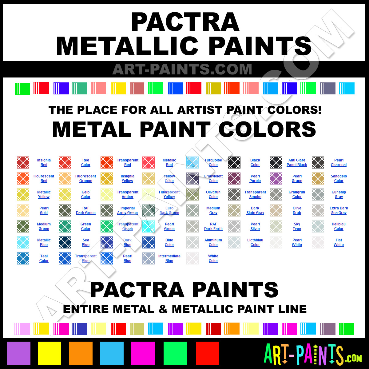 Pactra knows Metal and Metallic Paints! They make wonderful brands of Paint for all types of artists. They strive to perfect the process of color and are one of the most popular Metal Paint Brand companies in the world. Whether this Paint is used for Metal Surfaces or just giving a Metallic look, you're sure to enjoy their entire collection. Pactra makes a couple different types of Metal Paints including its Racing Finish Paints, Basic Paints, Fluorescent Paints, German Luftwaffe Paints, Japanese Imperial Paints, Metallic Candy Paints, Modern US Armed Forces Paints, Pearl Color Paints, Royal Air Force Fleet Paints, US Army Navy Paints, WWII Modern Tactical Paints and Transparent Paints! Choose an Metal Paint type below to view that Brand and Colors and Hues.     -Art-Paints.com