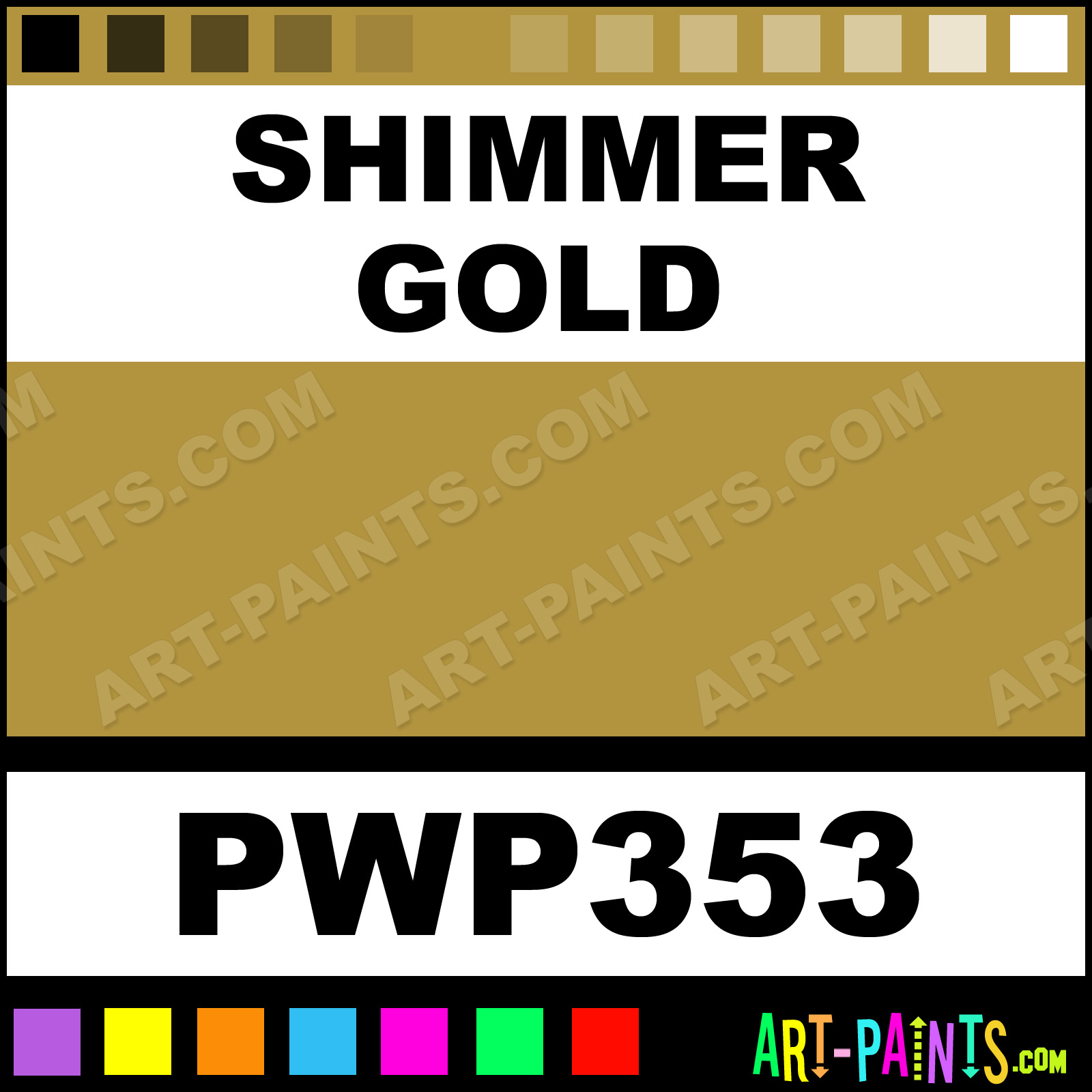 This beautiful Candy Metal Paint Color shade is called Shimmer Gold, and comes from a company called Paint With Pearl. Their product number, along with the HTML color code, RGB, and CMYK codes are listed below. This Beautiful Shade of Shimmer Gold and other Metal and Metallic Paint Colors can be found in the Paint With Pearl Candy Art Paint Gallery! Also be sure to browse through the other wonderful Professional Paint Color Galleries to see more of Paint With Pearl Candy Metal Paints and other Metallic Paint Manufacturers.   -Art-Paints.com