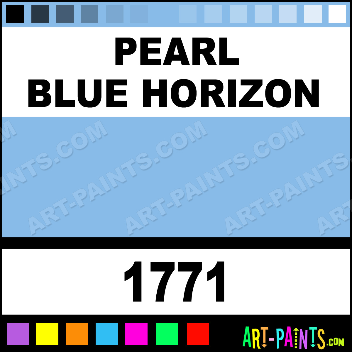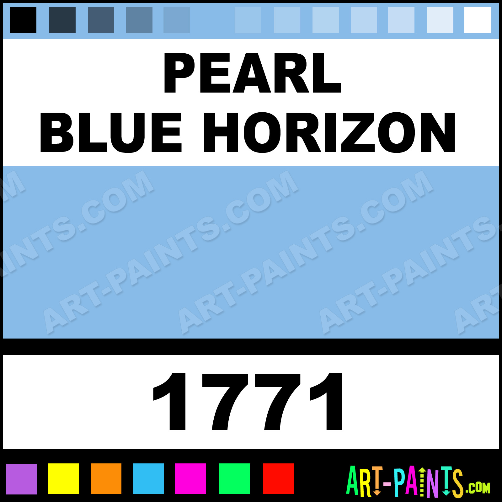 This beautiful Prism Metal or Metallic Paint shade is called Pearl Blue Horizon, and comes from a company called Palmer. Their product number, along with the HTML color code, RGB, and CMYK codes are listed below. This Beautiful Shade of Pearl Blue Horizon and others can be found in the Palmer Prism Art Paint Gallery! Also be sure to browse through the other wonderful Professional Color Galleries to see more of Palmer Prism Metal Paints and other Metal and Metallic Paint Manufacturers.   -Art-Paints.com