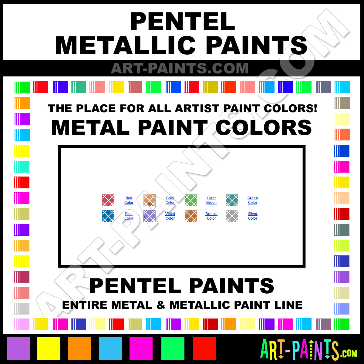Pentel knows Metal and Metallic Paints! They make wonderful brands of Paint for all types of artists. They strive to perfect the process of color and are one of the most popular Metal Paint Brand companies in the world. Whether this Paint is used for Metal Surfaces or just giving a Metallic look, you're sure to enjoy their entire collection. Pentel makes a couple different types of Metal Paints including its Metallic Brush Marker Paints and its Metallic Brush Pens Paints! Choose an Metal Paint type below to view that Brand and Colors and Hues.     -Art-Paints.com
