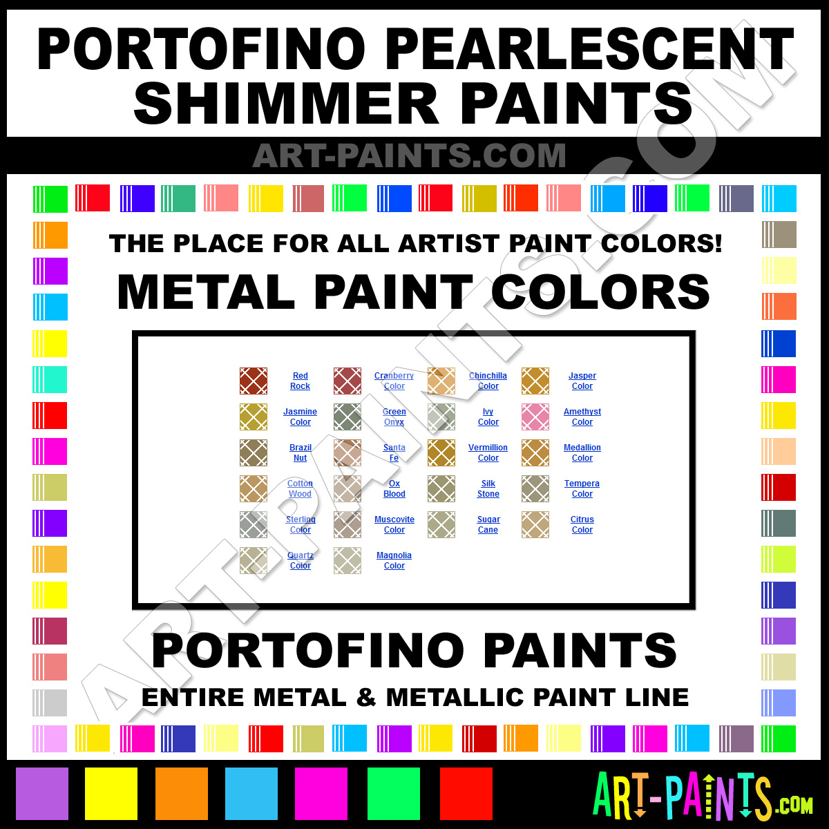 Portofino knows Metal Paints! They make a wonderful brand of paint called Portofino Pearlescent Shimmer Metal Paint Colors that suits all types of artists. Great for Painting on Metal or Paints that look Metallic, either way they strive to perfect the process of color and are one of the most popular Metal Paint Brand companies in the world. Enjoy their entire Paint Brand collection below. Portofino makes wonderful Artists Metallic Paints that everyone is sure to enjoy! Choose a Metal Paint below to view that Hue or Color.     -Art-Paints.com