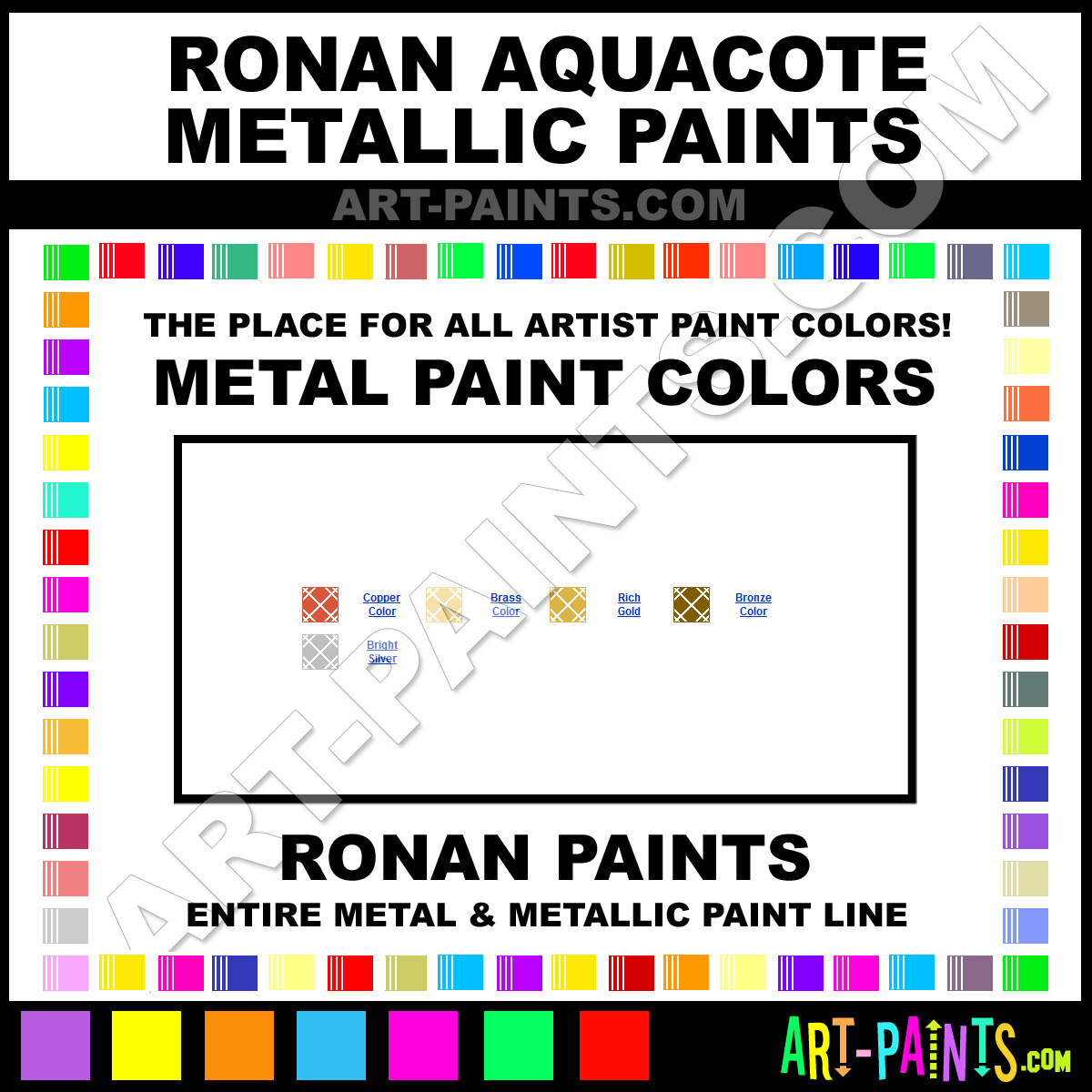 Ronan knows Metal Paints! They make a wonderful brand of paint called Ronan Aquacote Metallic Metal Paint Colors that suits all types of artists. Great for Painting on Metal or Paints that look Metallic, either way they strive to perfect the process of color and are one of the most popular Metal Paint Brand companies in the world. Enjoy their entire Paint Brand collection below. Ronan makes wonderful Artists Metallic Paints that everyone is sure to enjoy! Choose a Metal Paint below to view that Hue or Color.     -Art-Paints.com