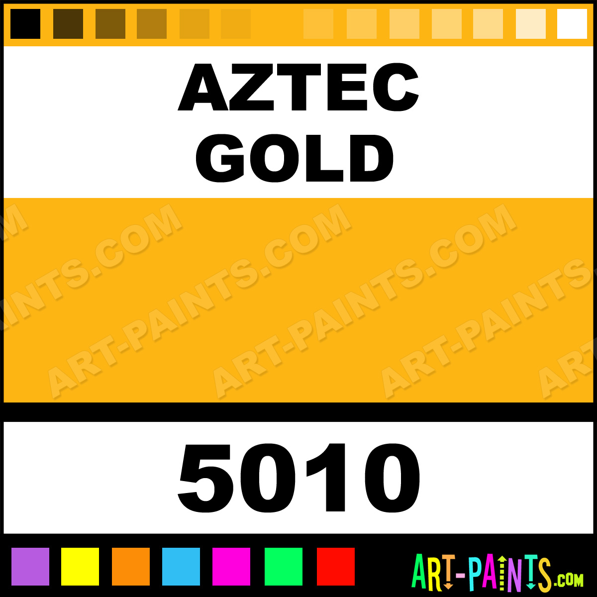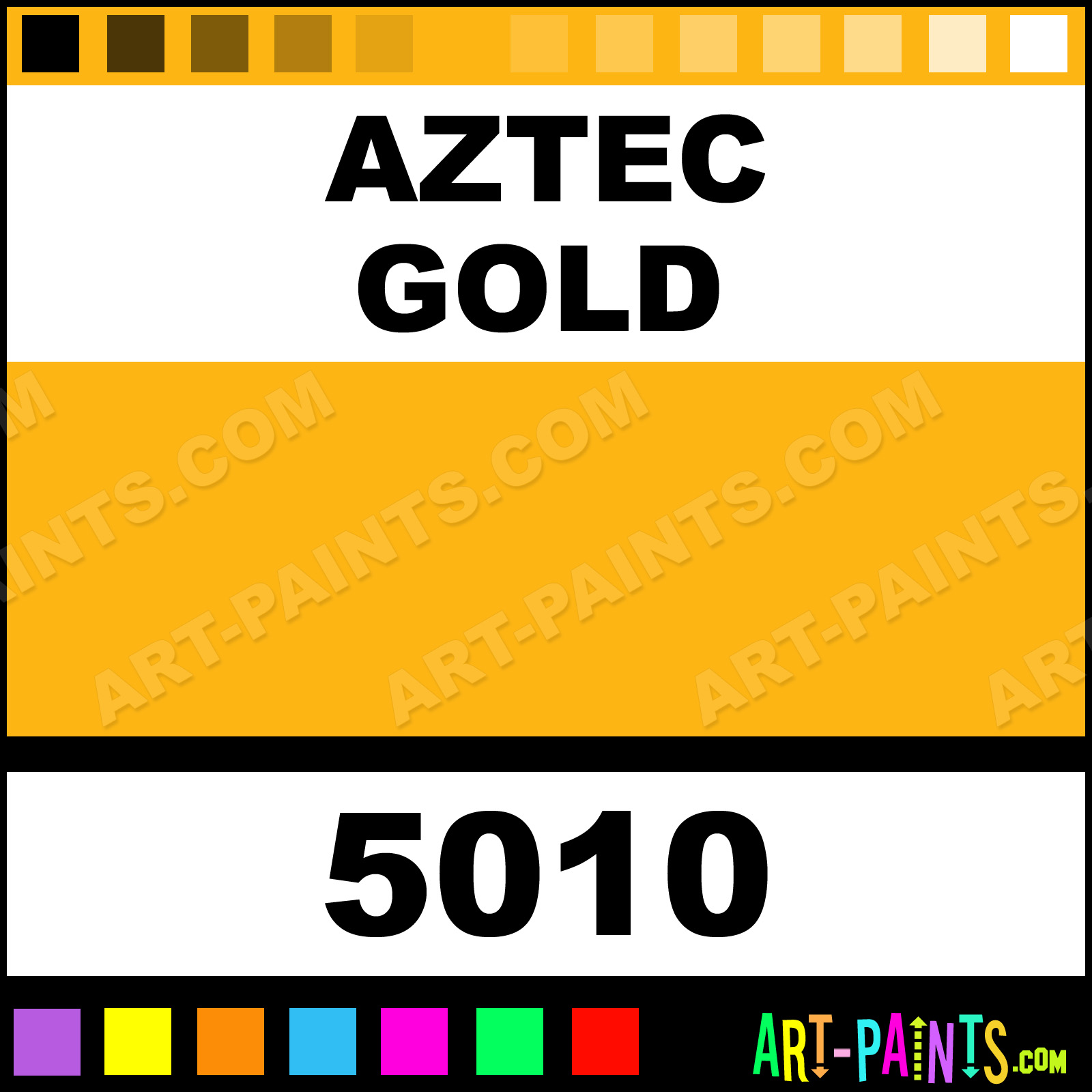 This beautiful Metallic Tempera Metal or Metallic Paint shade is called Aztec Gold, and comes from a company called Sargent Art. Their product number, along with the HTML color code, RGB, and CMYK codes are listed below. This Beautiful Shade of Aztec Gold and others can be found in the Sargent Art Metallic Tempera Art Paint Gallery! Also be sure to browse through the other wonderful Professional Color Galleries to see more of Sargent Art Metallic Tempera Metal Paints and other Metal and Metallic Paint Manufacturers.   -Art-Paints.com