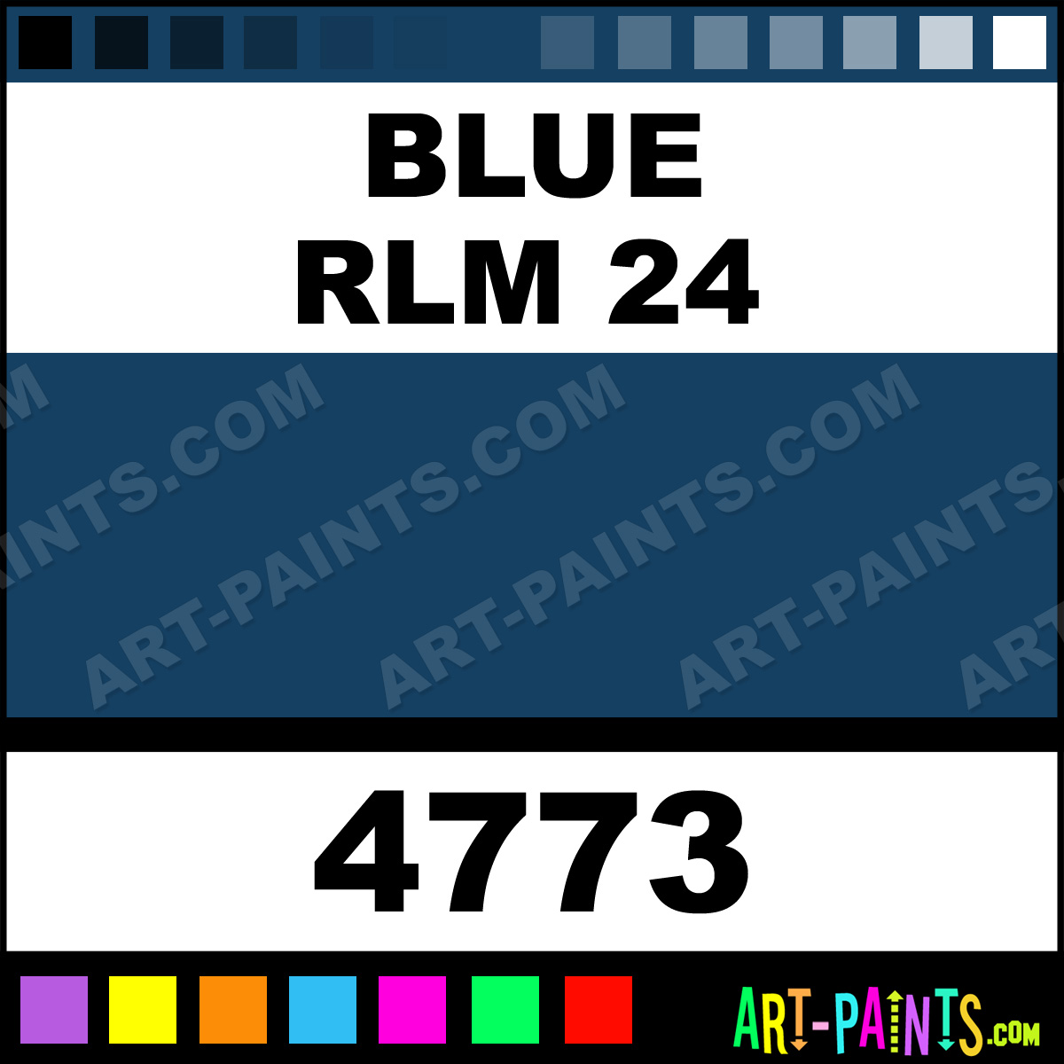 This beautiful Model Master Metal Paint Color shade is called Blue RLM 24, and comes from a company called Testors. Their product number, along with the HTML color code, RGB, and CMYK codes are listed below. This Beautiful Shade of Blue RLM 24 and other Metal and Metallic Paint Colors can be found in the Testors Model Master Art Paint Gallery! Also be sure to browse through the other wonderful Professional Paint Color Galleries to see more of Testors Model Master Metal Paints and other Metallic Paint Manufacturers.   -Art-Paints.com