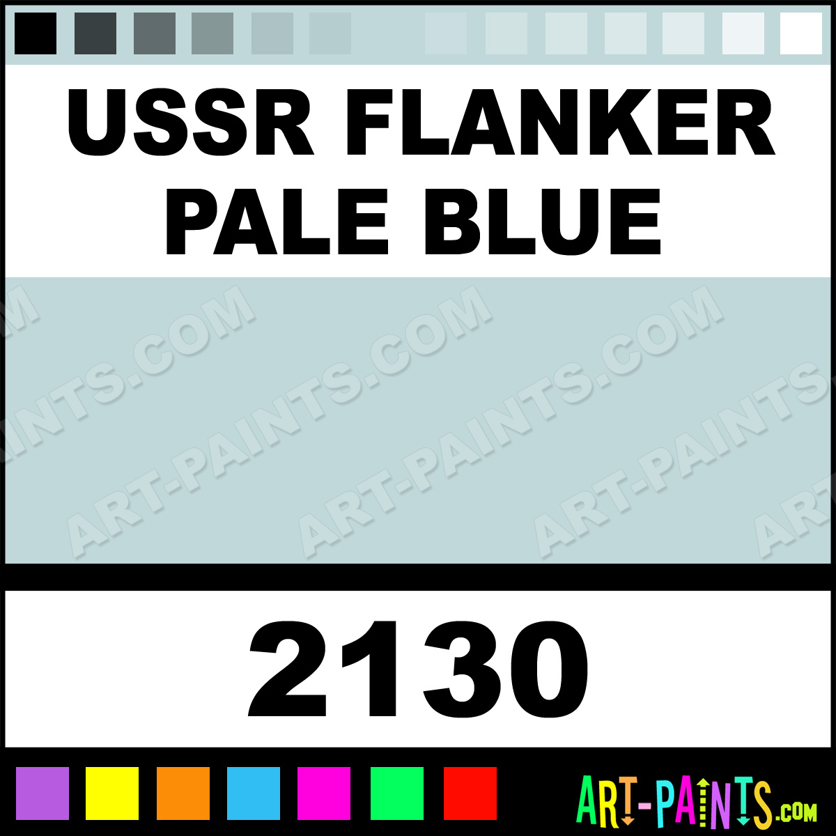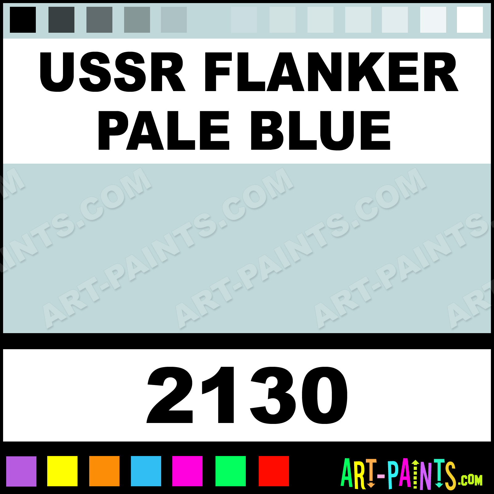 This beautiful Model Metal Paint Color shade is called USSR Flanker Pale Blue, and comes from a company called Testors. Their product number, along with the HTML color code, RGB, and CMYK codes are listed below. This Beautiful Shade of USSR Flanker Pale Blue and other Metal and Metallic Paint Colors can be found in the Testors Model Art Paint Gallery! Also be sure to browse through the other wonderful Professional Paint Color Galleries to see more of Testors Model Metal Paints and other Metallic Paint Manufacturers.   -Art-Paints.com