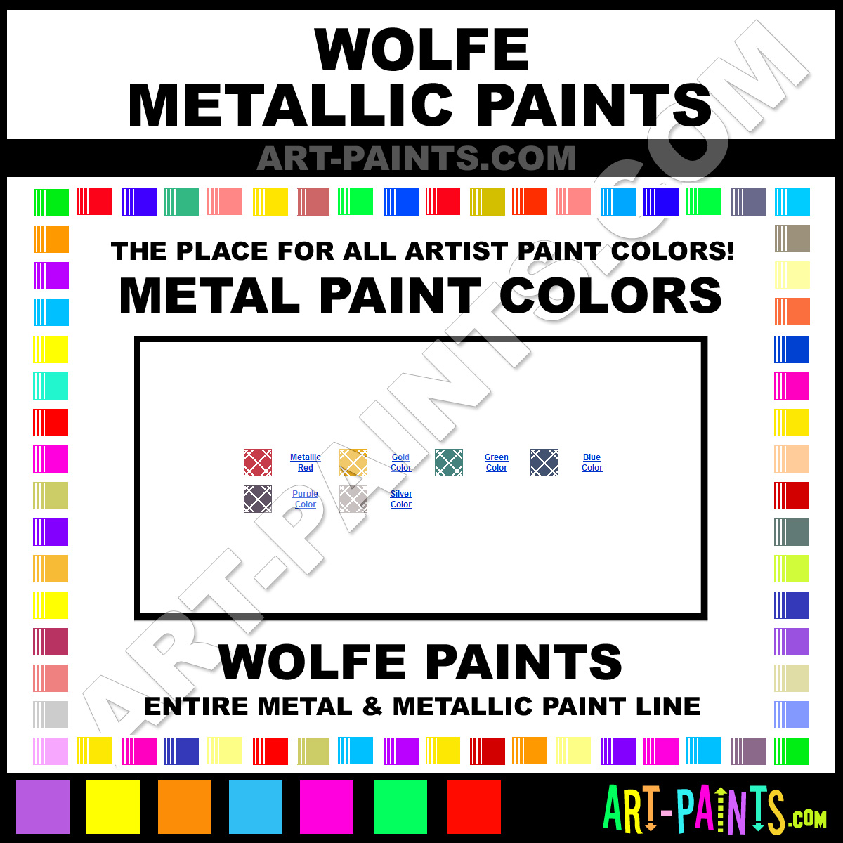 Wolfe knows Metal Paints! They make a wonderful brand of Paint called Wolfe Metallic Metal Paint Colors that suits all types of artists. They strive to perfect the process of color, good for Metal surfaces or good for giving you that Metallic look! They are one of the most popular Metal Paint Brand companies in the world. Enjoy their entire paint brand collection below. Wolfe makes wonderful Artists Metal and Metallic Paints that everyone is sure to enjoy! Choose an Metal Paint Color below to view that Hue and Colors.     -Art-Paints.com