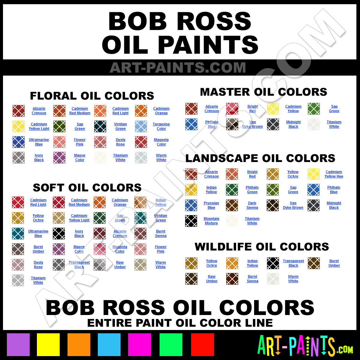 Bob Ross makes beautiful Oil Paint brands. With a complete line of Floral, Master, Soft, Wildlife and Landscape Oil Lines, and 66 colors in all, available in just about every hue and color, they will no doubt keep you painting and smiling at the same time. Each Brand is unique and the variety of paints is exquisite!