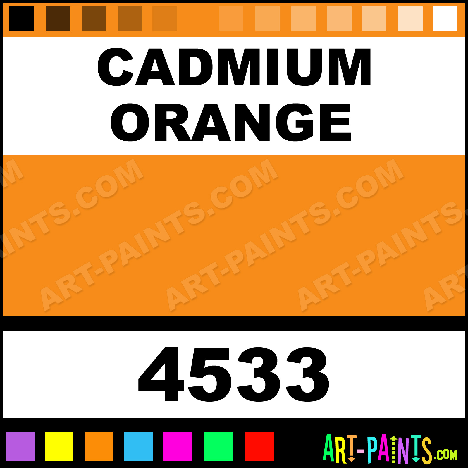 This beautiful Artists Oil shade is called Cadmium Orange, and comes from a company called Gamblin. Their product number, along with the HTML color code, RGB, and CMYK codes are listed below. This Beautiful Shade of Cadmium Orange and others can be found in the Gamblin Artists Art Paint Gallery! Also be sure to browse through the other wonderful Professional Color Galleries to see more of Gamblin Artists Oil Brand Paints and other Paint Manufacturers. And as always, Paint Paint Paint! -Art-Paints.com