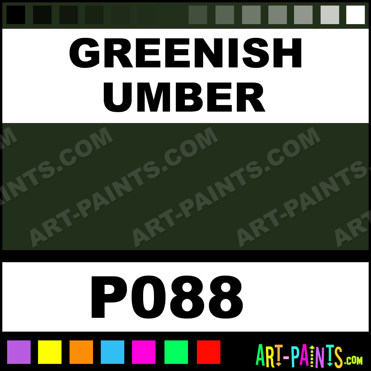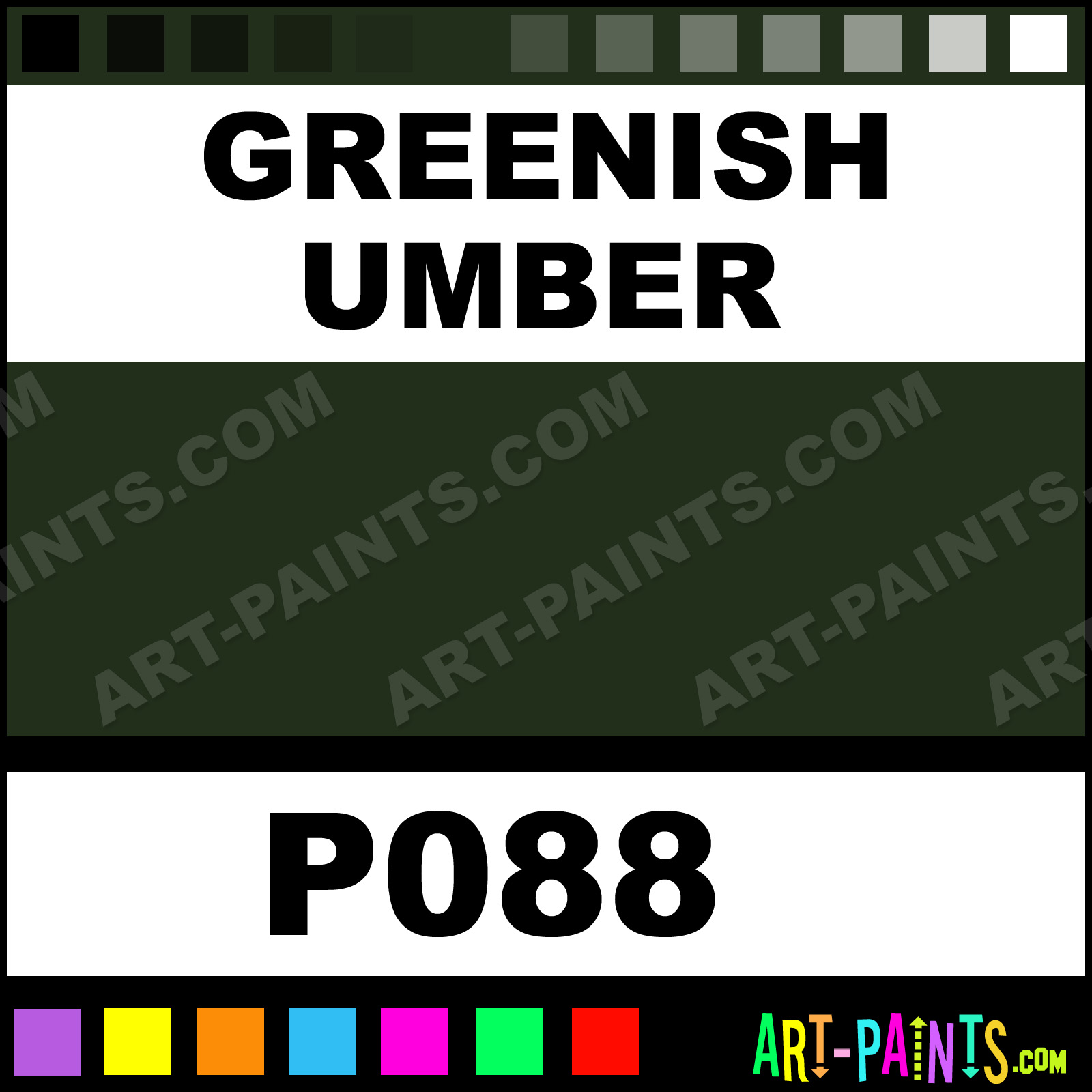 This beautiful Pre-Tested Oil shade is called Greenish Umber, and comes from a company called Grumbacher. Their product number, along with the HTML color code, RGB, and CMYK codes are listed below. This Beautiful Shade of Greenish Umber and others can be found in the Grumbacher Pre-Tested Art Paint Gallery! Also be sure to browse through the other wonderful Professional Color Galleries to see more of Grumbacher Pre-Tested Oil Brand Paints and other Paint Manufacturers. And as always, Paint Paint Paint! -Art-Paints.com