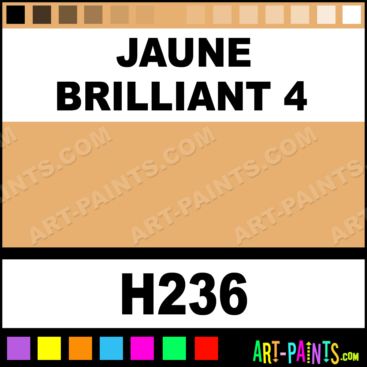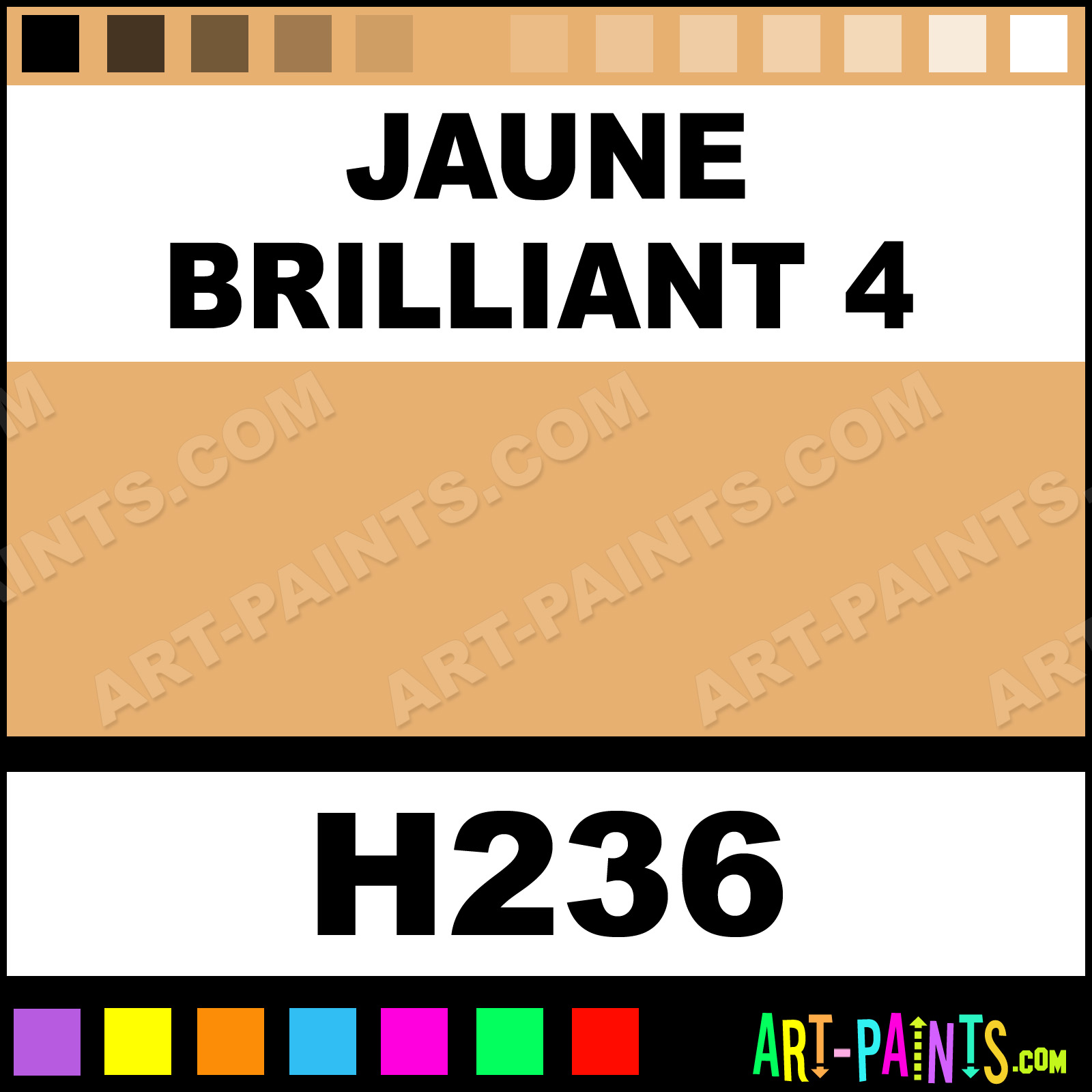 This beautiful Artist Oil shade is called Jaune Brilliant 4, and comes from a company called Holbein. Their product number, along with the HTML color code, RGB, and CMYK codes are listed below. This Beautiful Shade of Jaune Brilliant 4 and others can be found in the Holbein Artist Art Paint Gallery! Also be sure to browse through the other wonderful Professional Color Galleries to see more of Holbein Artist Oil Brand Paints and other Paint Manufacturers. And as always, Paint Paint Paint! -Art-Paints.com