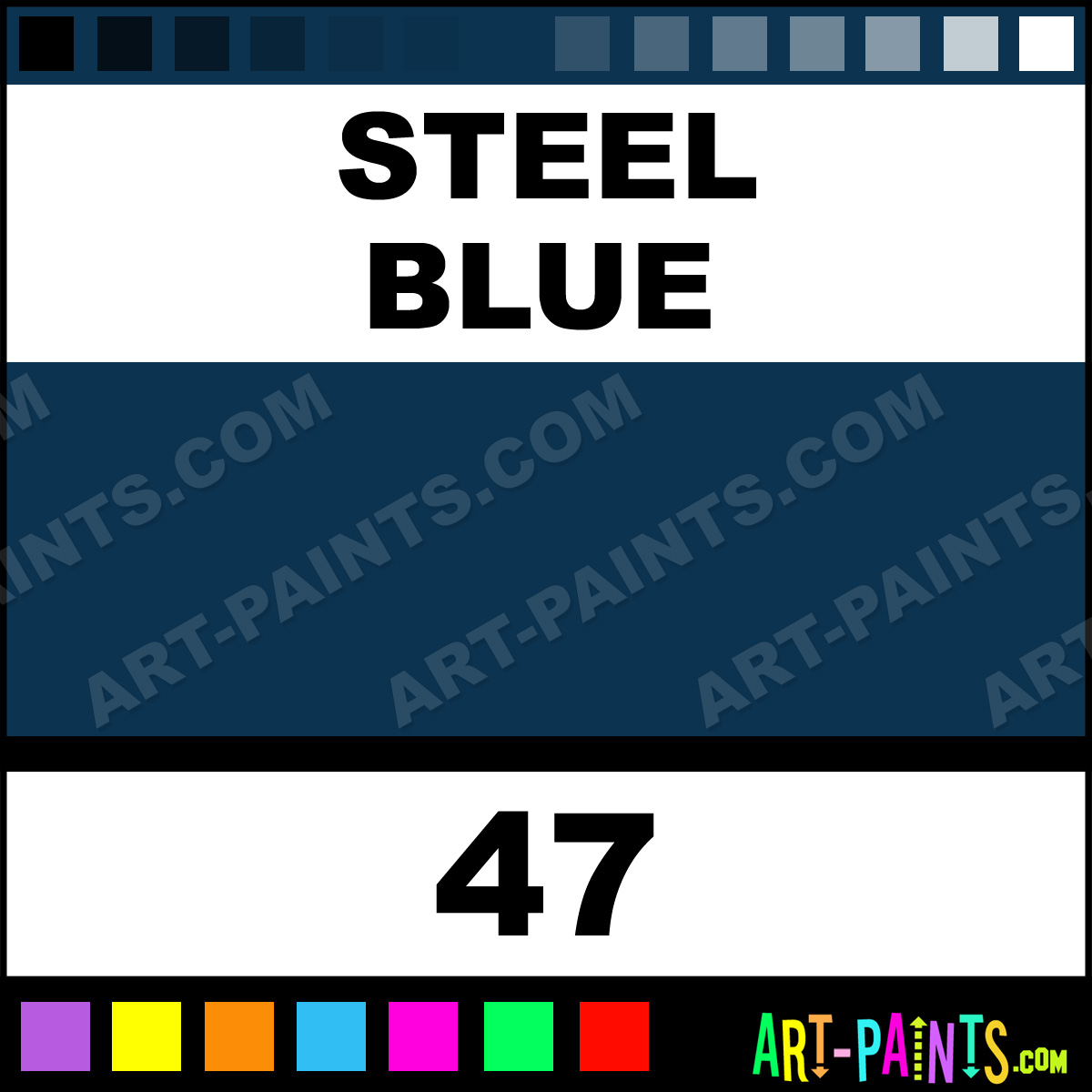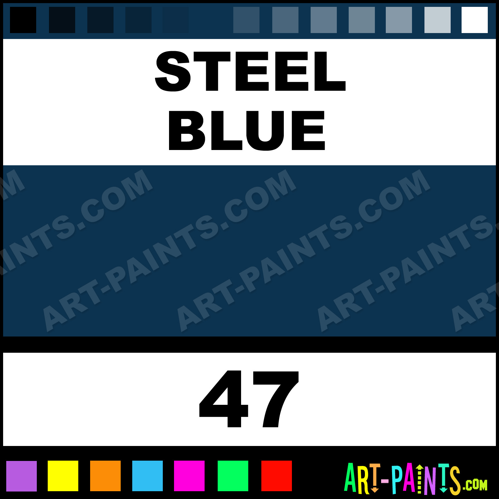 This beautiful XL Studio Oil shade is called Steel Blue, and comes from a company called Pebeo. Their product number, along with the HTML color code, RGB, and CMYK codes are listed below. This Beautiful Shade of Steel Blue and others can be found in the Pebeo XL Studio Art Paint Gallery! Also be sure to browse through the other wonderful Professional Color Galleries to see more of Pebeo XL Studio Oil Brand Paints and other Paint Manufacturers. And as always, Paint Paint Paint! -Art-Paints.com