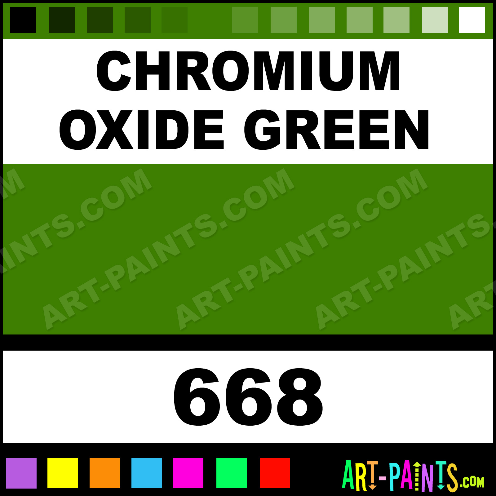 This beautiful Oil Colors Oil shade is called Chromium Oxide Green, and comes from a company called Van Gogh. Their product number, along with the HTML color code, RGB, and CMYK codes are listed below. This Beautiful Shade of Chromium Oxide Green and others can be found in the Van Gogh Oil Colors Art Paint Gallery! Also be sure to browse through the other wonderful Professional Color Galleries to see more of Van Gogh Oil Colors Oil Brand Paints and other Paint Manufacturers. And as always, Paint Paint Paint! -Art-Paints.com