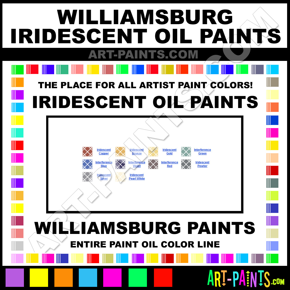 Williamsburg makes a beautiful Iridescent Paint Brand. With a complete line of Oil Color Paints, 10 colors in all, available in beautiful hues and colors, they will no doubt keep you painting and smiling at the same time. This brand is very unique and exquisite!