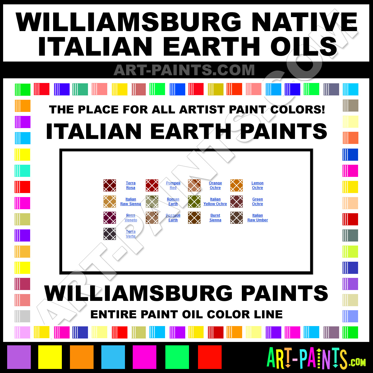Williamsburg makes a beautiful Native Italian Earth Paint Brand. With a complete line of Oil Color Paints, 13 colors in all, available in beautiful hues and colors, they will no doubt keep you painting and smiling at the same time. This brand is very unique and exquisite!