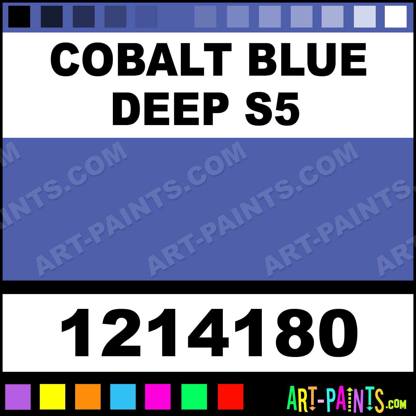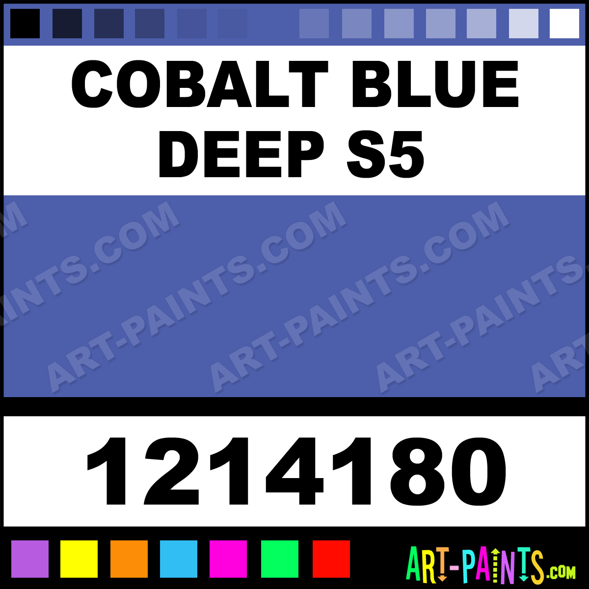 This beautiful Artists Oil shade is called Cobalt Blue Deep S5, and comes from a company called Winsor and Newton. Their product number, along with the HTML color code, RGB, and CMYK codes are listed below. This Beautiful Shade of Cobalt Blue Deep S5 and others can be found in the Winsor and Newton Artists Art Paint Gallery! Also be sure to browse through the other wonderful Professional Color Galleries to see more of Winsor and Newton Artists Oil Brand Paints and other Paint Manufacturers. And as always, Paint Paint Paint! -Art-Paints.com