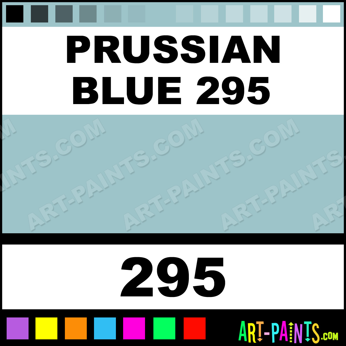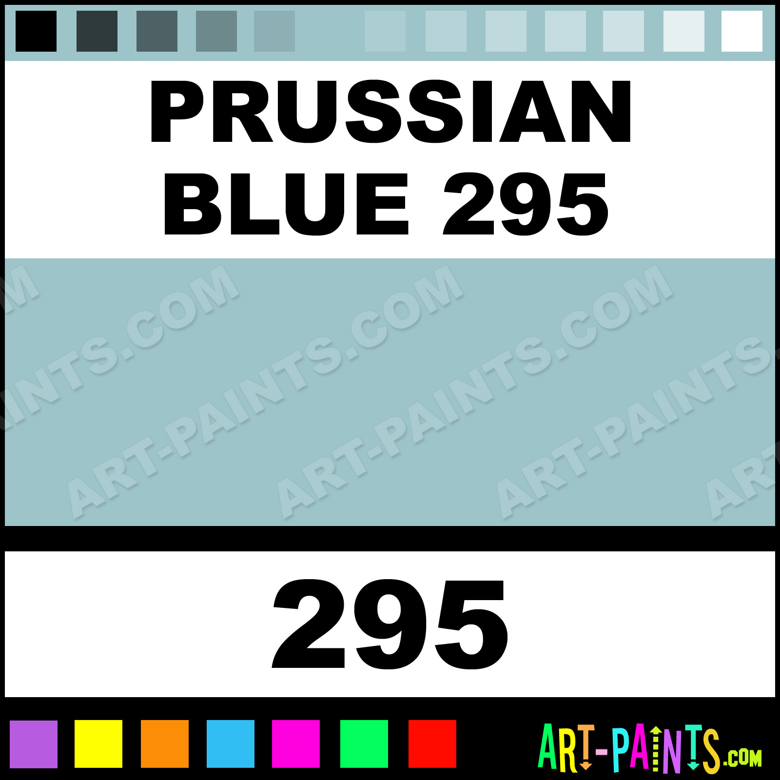 This beautiful Flower and Fruit Pastel shade is called Prussian Blue 295, and comes from a company called Girault. Their product number, along with the HTML color code, RGB, and CMYK codes are listed below. This Beautiful Shade of Prussian Blue 295 and others can be found in the Girault Flower and Fruit Art Paint Gallery! Also be sure to browse through the other wonderful Professional Color Galleries to see more of Girault Flower and Fruit Pastel Brand Paints and other Paint Manufacturers. And as always, Paint Paint Paint! -Art-Paints.com