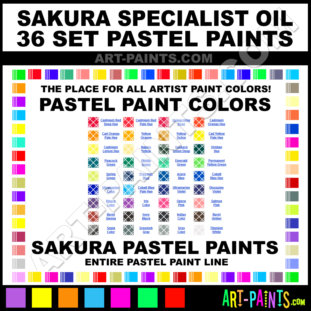 Sakura makes a beautiful Specialist Oil 36 Paint Brand. With a complete line of Pastel Color Paints, 36 colors in all, available in beautiful hues and colors, they will no doubt keep you painting and smiling at the same time. This brand is very unique and exquisite!