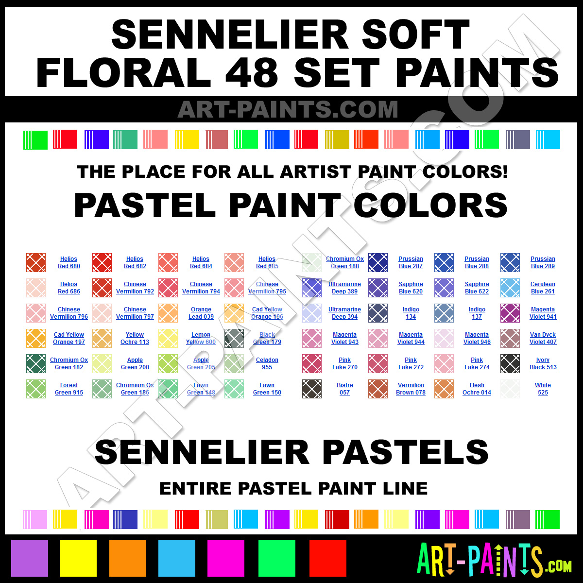 Sennelier makes a beautiful Soft Floral 48 Paint Brand. With a complete line of Pastel Color Paints, 48 colors in all, available in beautiful hues and colors, they will no doubt keep you painting and smiling at the same time. This brand is very unique and exquisite!