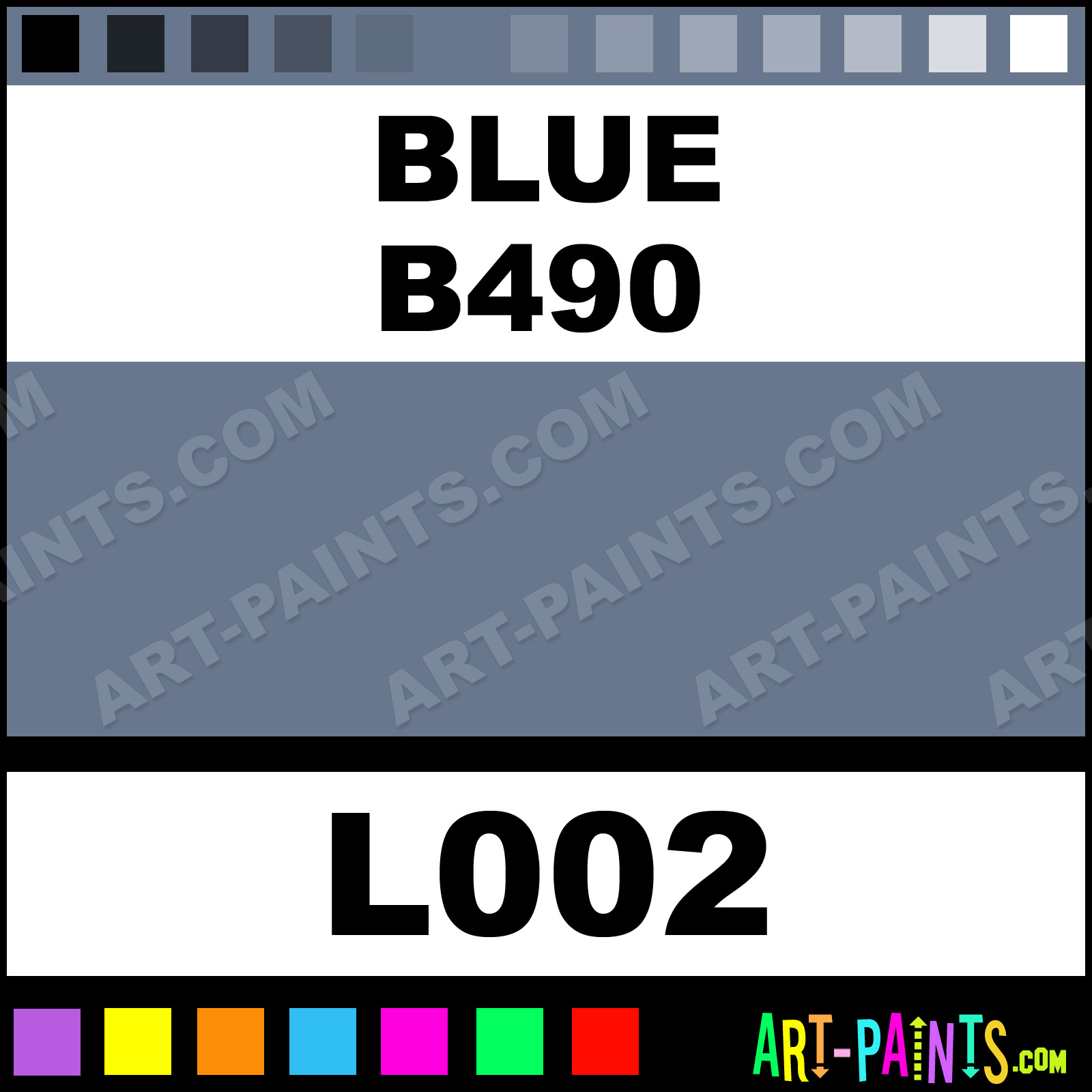 This beautiful Arid Landscape Pastel shade is called Blue B490, and comes from a company called Terry Ludwig. Their product number, along with the HTML color code, RGB, and CMYK codes are listed below. This Beautiful Shade of Blue B490 and others can be found in the Terry Ludwig Arid Landscape Art Paint Gallery! Also be sure to browse through the other wonderful Professional Color Galleries to see more of Terry Ludwig Arid Landscape Pastel Brand Paints and other Paint Manufacturers. And as always, Paint Paint Paint! -Art-Paints.com