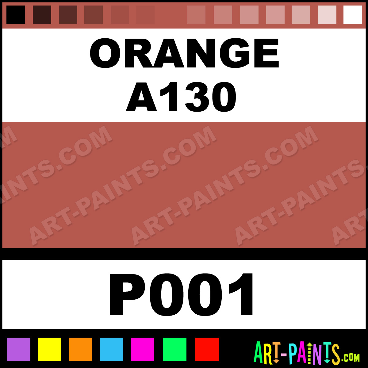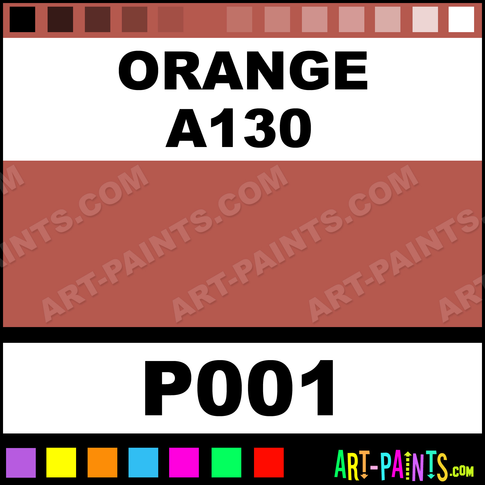 This beautiful Portrait Pastel shade is called Orange A130, and comes from a company called Terry Ludwig. Their product number, along with the HTML color code, RGB, and CMYK codes are listed below. This Beautiful Shade of Orange A130 and others can be found in the Terry Ludwig Portrait Art Paint Gallery! Also be sure to browse through the other wonderful Professional Color Galleries to see more of Terry Ludwig Portrait Pastel Brand Paints and other Paint Manufacturers. And as always, Paint Paint Paint! -Art-Paints.com