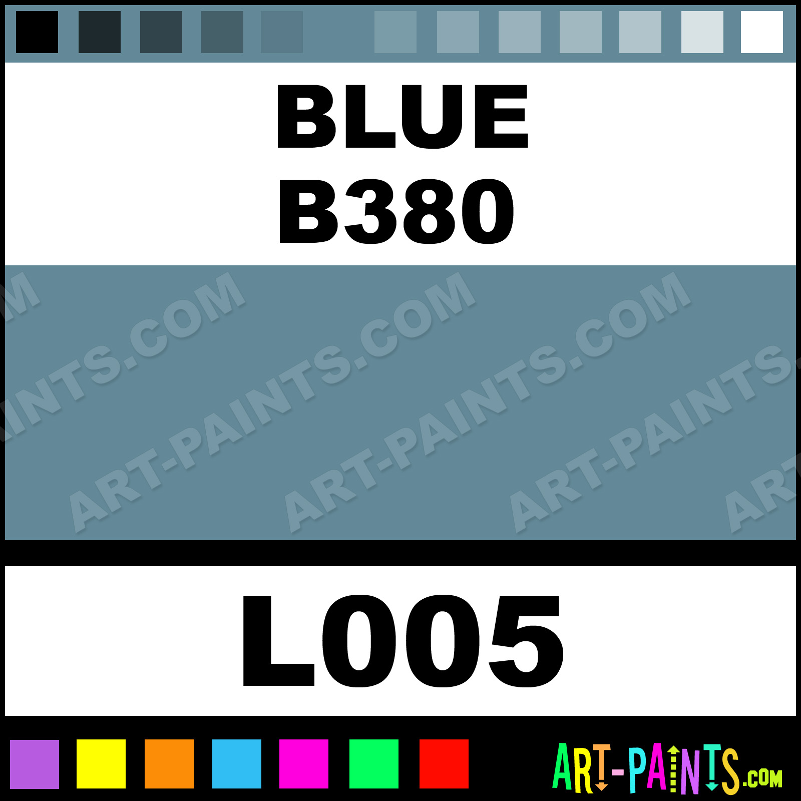 This beautiful Southeast Landscape Pastel shade is called Blue B380, and comes from a company called Terry Ludwig. Their product number, along with the HTML color code, RGB, and CMYK codes are listed below. This Beautiful Shade of Blue B380 and others can be found in the Terry Ludwig Southeast Landscape Art Paint Gallery! Also be sure to browse through the other wonderful Professional Color Galleries to see more of Terry Ludwig Southeast Landscape Pastel Brand Paints and other Paint Manufacturers. And as always, Paint Paint Paint! -Art-Paints.com