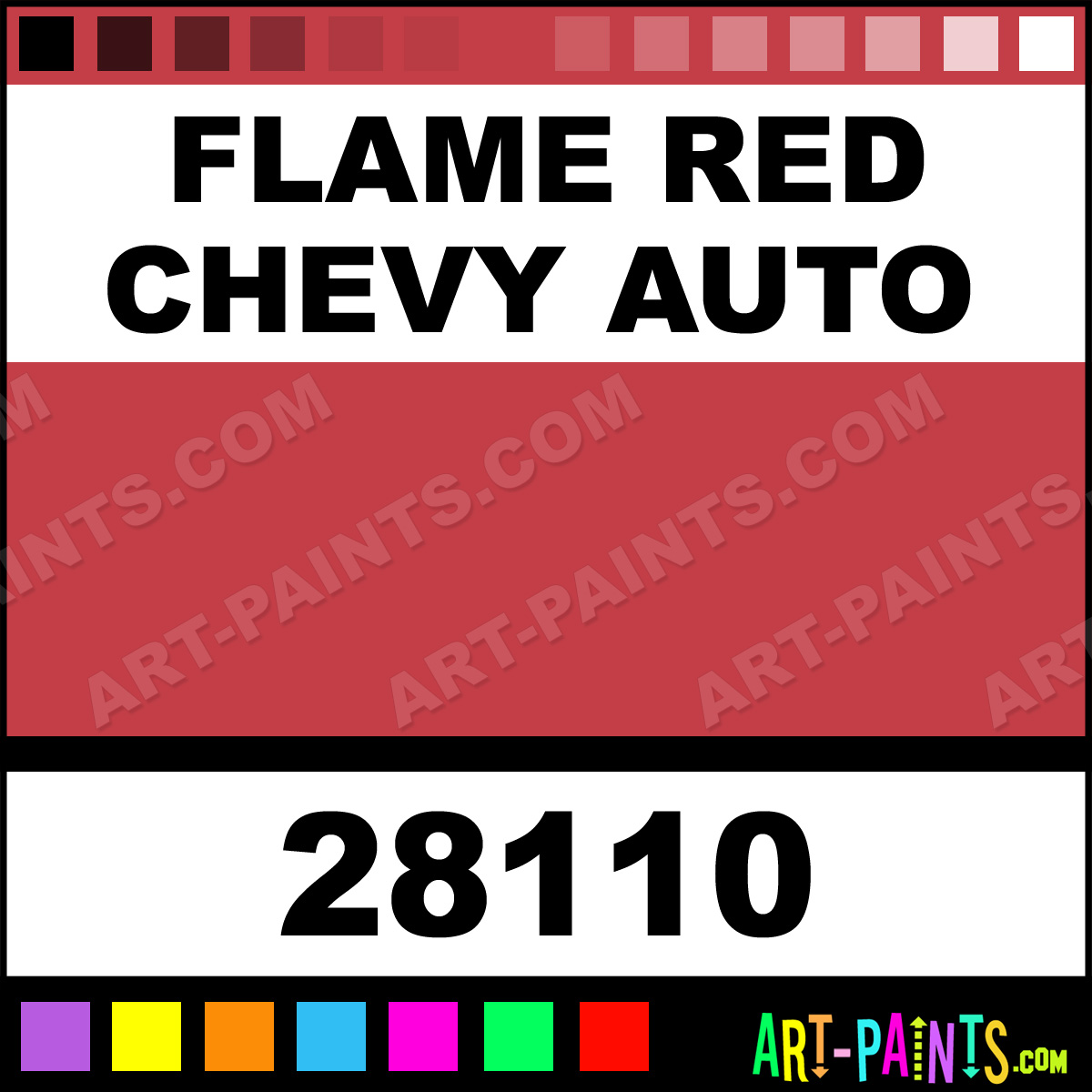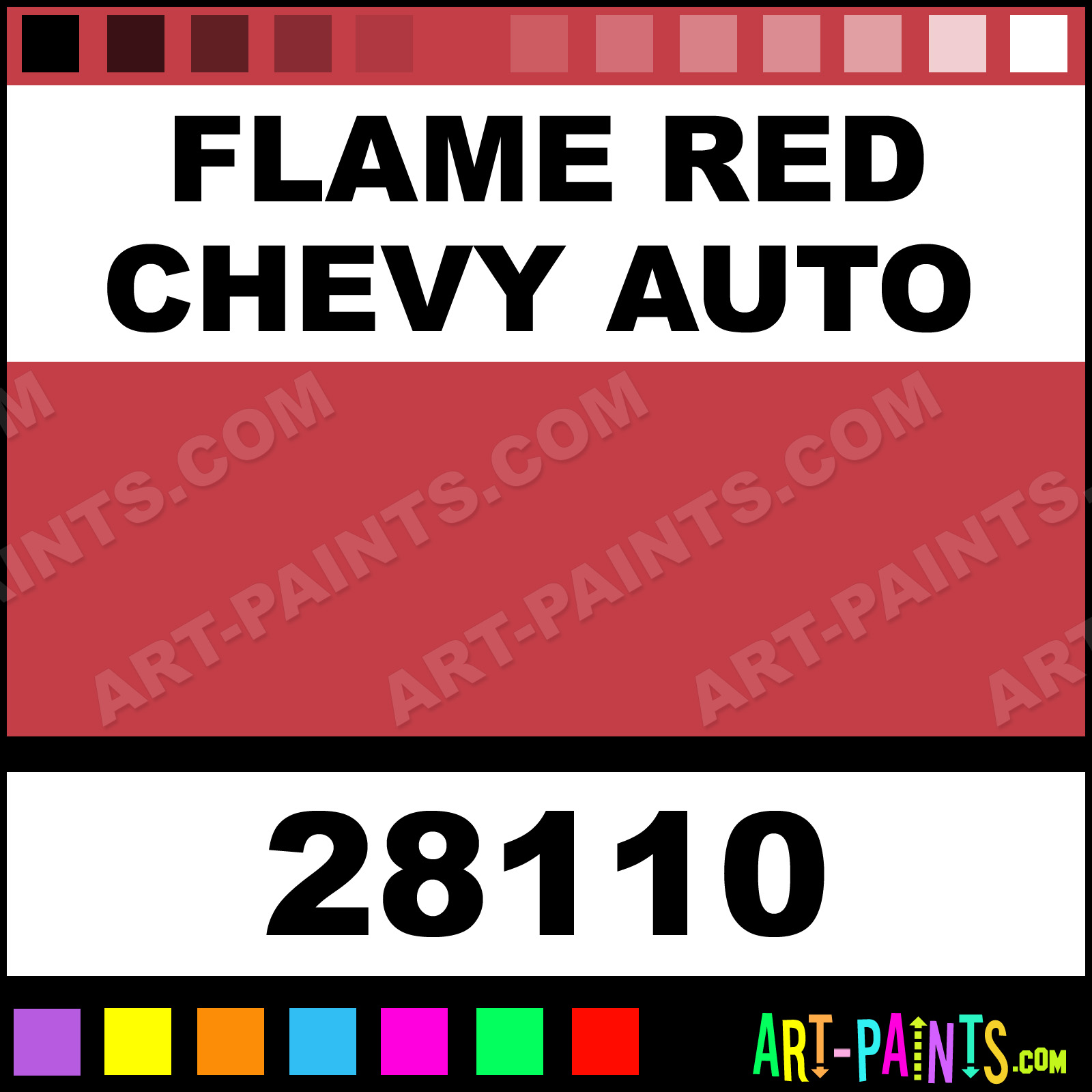 This beautiful Auto Lacquer Spray Paint shade is called Flame Red Chevy Auto, and comes from a Aerosol company called Model Master. Their product number, along with the HTML color code, RGB, and CMYK codes are listed below. This Beautiful Shade of Flame Red Chevy Auto and others can be found in the Model Master Auto Lacquer Art Paint Gallery! Also be sure to browse through the other wonderful Professional Color Galleries which are great for Decorative Art or Graffiti Art to see more of Model Master Auto Lacquer Spray Paints, Brands and other Aerosol Paint Manufacturers. And as always, Paint Paint Paint!   -Art-Paints.com