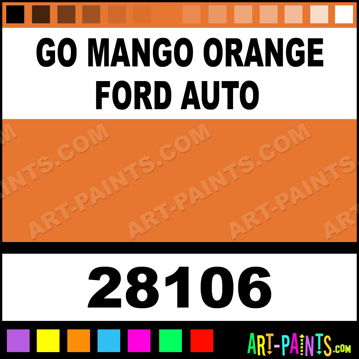 This beautiful Auto Lacquer Spray Paint shade is called Go Mango Orange Ford Auto, and comes from a Aerosol company called Model Master. Their product number, along with the HTML color code, RGB, and CMYK codes are listed below. This Beautiful Shade of Go Mango Orange Ford Auto and others can be found in the Model Master Auto Lacquer Art Paint Gallery! Also be sure to browse through the other wonderful Professional Color Galleries which are great for Decorative Art or Graffiti Art to see more of Model Master Auto Lacquer Spray Paints, Brands and other Aerosol Paint Manufacturers. And as always, Paint Paint Paint!   -Art-Paints.com