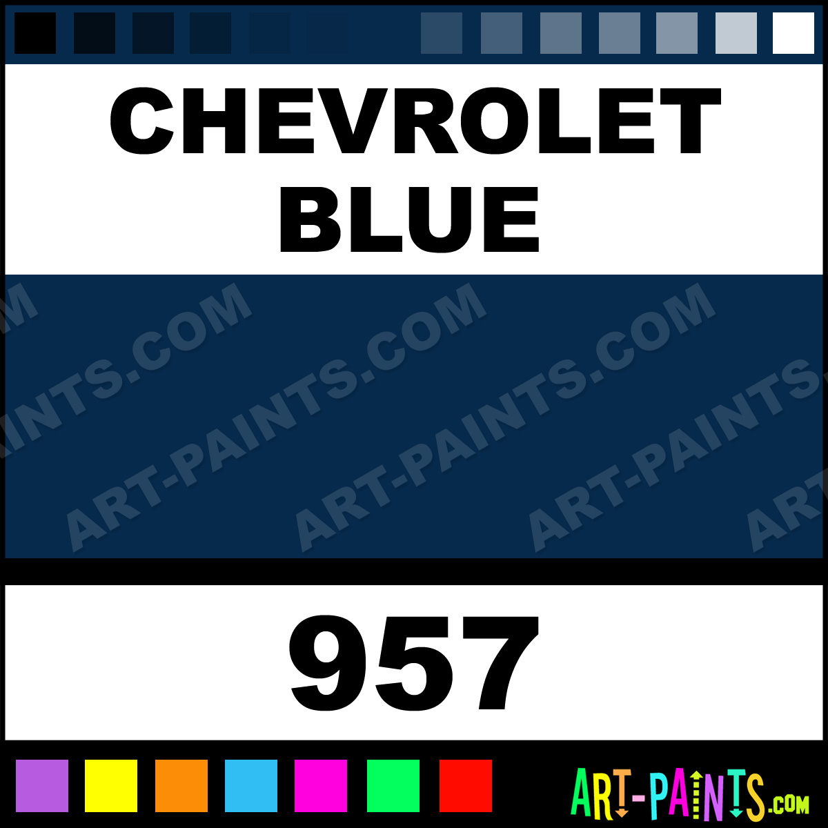 This beautiful Engine Coatings Spray Paint shade is called Chevrolet Blue, and comes from a Aerosol company called Orr-Lac. Their product number, along with the HTML color code, RGB, and CMYK codes are listed below. This Beautiful Shade of Chevrolet Blue and others can be found in the Orr-Lac Engine Coatings Art Paint Gallery! Also be sure to browse through the other wonderful Professional Color Galleries which are great for Decorative Art or Graffiti Art to see more of Orr-Lac Engine Coatings Spray Paints, Brands and other Aerosol Paint Manufacturers. And as always, Paint Paint Paint!   -Art-Paints.com