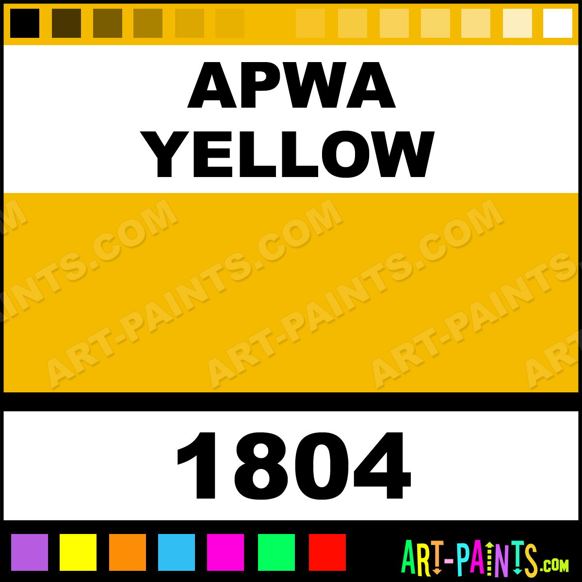 This beautiful Fluorescent Spray Paint shade is called APWA Yellow, and comes from a Aerosol company called Orr-Lac. Their product number, along with the HTML color code, RGB, and CMYK codes are listed below. This Beautiful Shade of APWA Yellow and others can be found in the Orr-Lac Fluorescent Art Paint Gallery! Also be sure to browse through the other wonderful Professional Color Galleries which are great for Decorative Art or Graffiti Art to see more of Orr-Lac Fluorescent Spray Paints, Brands and other Aerosol Paint Manufacturers. And as always, Paint Paint Paint!   -Art-Paints.com