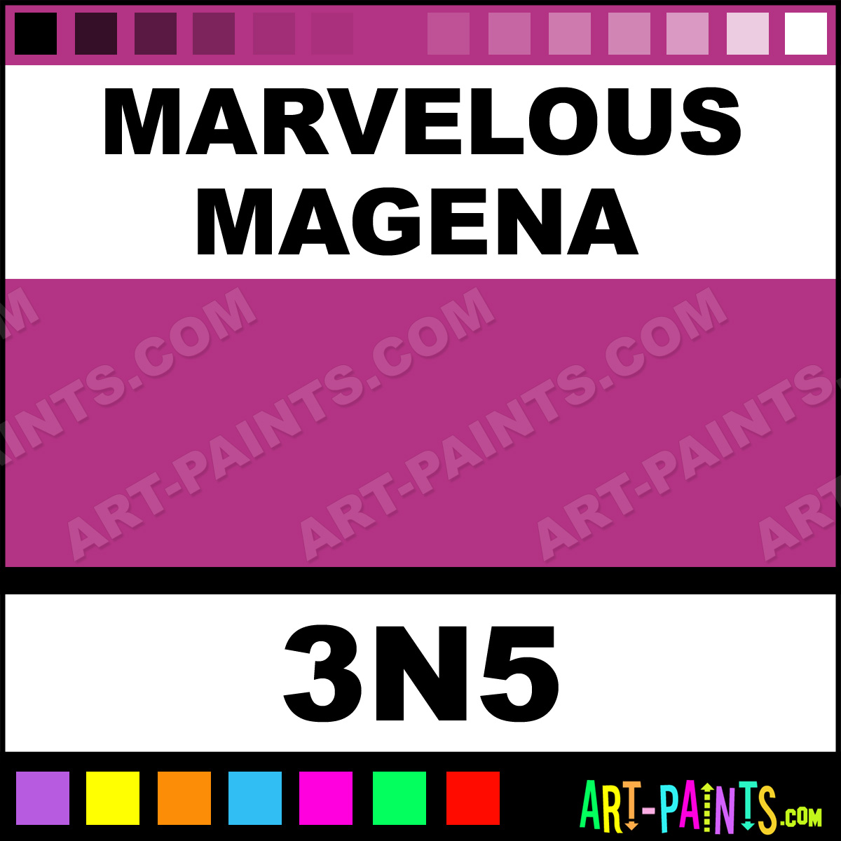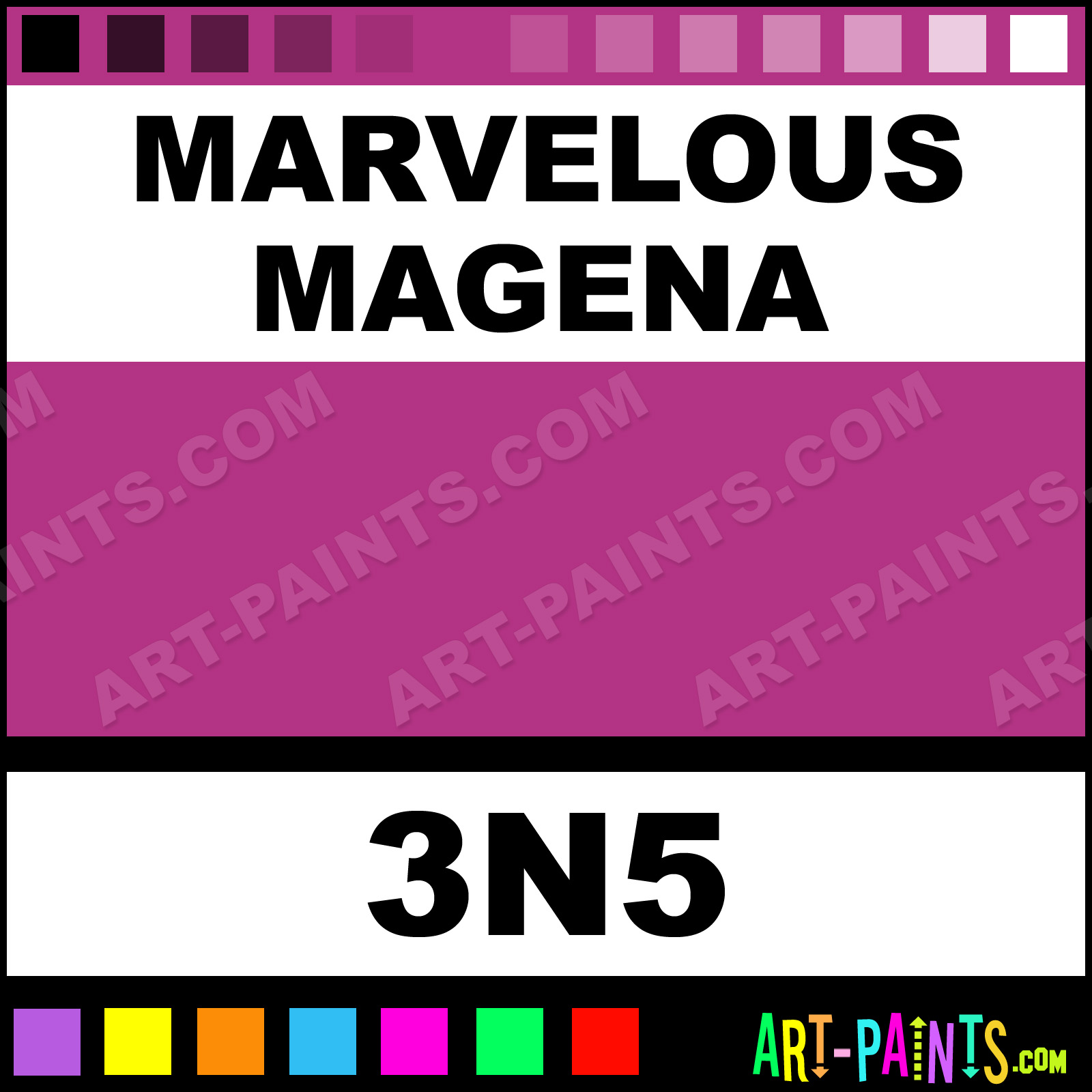This beautiful Millenium Tattoo Ink and Pigment shade is called Marvelous Magena, and comes from a company called MOMS. Their product number, along with the HTML color code, RGB, and CMYK codes are listed below. This Beautiful Shade of Marvelous Magena and others can be found in the MOMS Millenium Art Paint Gallery! Also be sure to browse through the other wonderful Professional Ink Color Galleries to see more of MOMS Millenium Tattoo Ink Brand Paints and other Pigment Paint Manufacturers. And as always, Paint Paint Paint! -Art-Paints.com