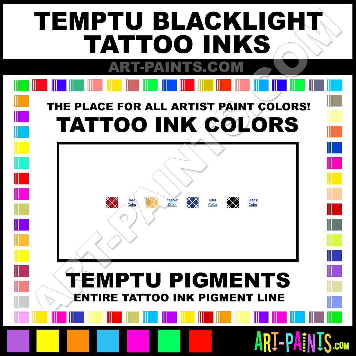 TempTu knows Tattoo paints! They make a wonderful brand of paint called TempTu Blacklight Tattoo Ink Pigment Colors that suits all types of artists. They strive to perfect the process of color and are one of the most popular Tattoo Ink Paint Brand companies in the world. Enjoy their entire paint brand collection from the list below. TempTu makes wonderful Artists Ink Paints that everyone is sure to enjoy! Choose an Tattoo Ink Pigment Paint Color below to view that Hue and all their great related paints.     -Art-Paints.com