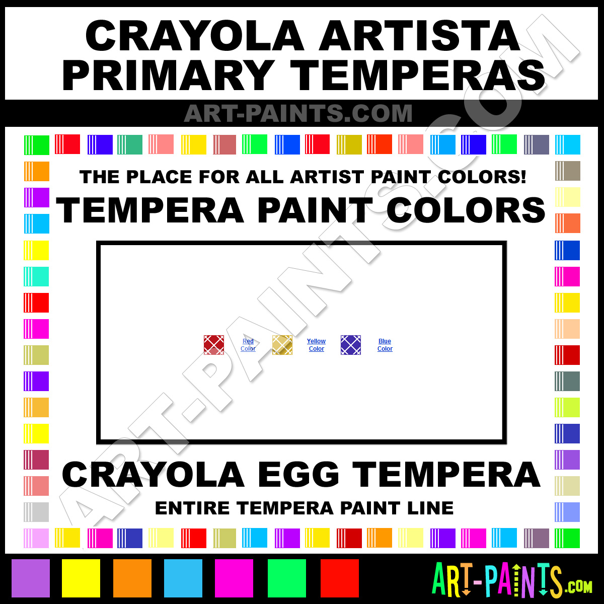 Crayola knows Egg Tempera paints! They make a wonderful brand of paint called Crayola Artista Primary 3 Set Egg Tempera Colors that suits all types of artists. They strive to perfect the process of color and are one of the most popular Tempera Paint Brand companies in the world. Enjoy their entire paint brand collection from the list below. Crayola makes wonderful Artists Paints that everyone is sure to enjoy! Choose an Egg Tempera Paint Color below to view that Hue and all their great related color paints. Paint on!     -Art-Paints.com