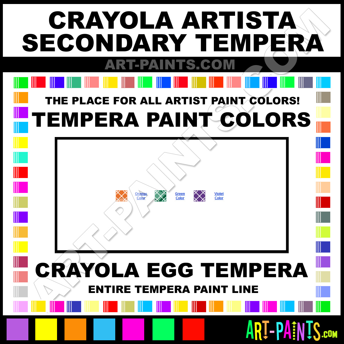 Crayola knows Egg Tempera paints! They make a wonderful brand of paint called Crayola Artista Secondary 3 Set Egg Tempera Colors that suits all types of artists. They strive to perfect the process of color and are one of the most popular Tempera Paint Brand companies in the world. Enjoy their entire paint brand collection from the list below. Crayola makes wonderful Artists Paints that everyone is sure to enjoy! Choose an Egg Tempera Paint Color below to view that Hue and all their great related color paints. Paint on!     -Art-Paints.com