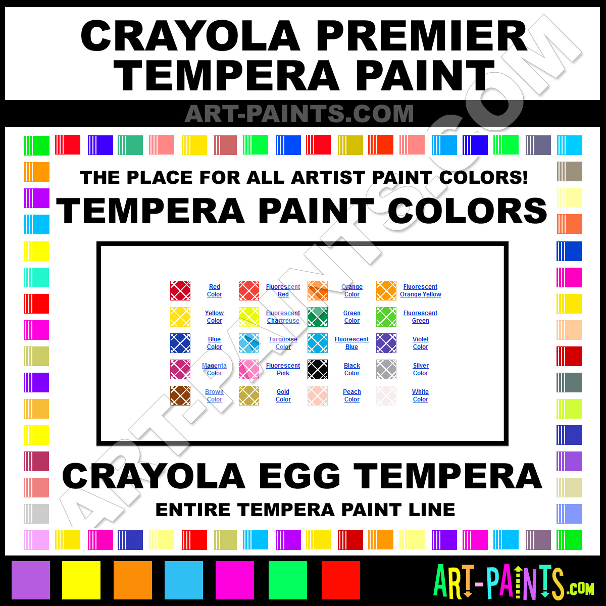 Crayola knows Egg Tempera paints! They make a wonderful brand of paint called Crayola Premier Egg Tempera Colors that suits all types of artists. They strive to perfect the process of color and are one of the most popular Tempera Paint Brand companies in the world. Enjoy their entire paint brand collection from the list below. Crayola makes wonderful Artists Paints that everyone is sure to enjoy! Choose an Egg Tempera Paint Color below to view that Hue and all their great related color paints. Paint on!     -Art-Paints.com
