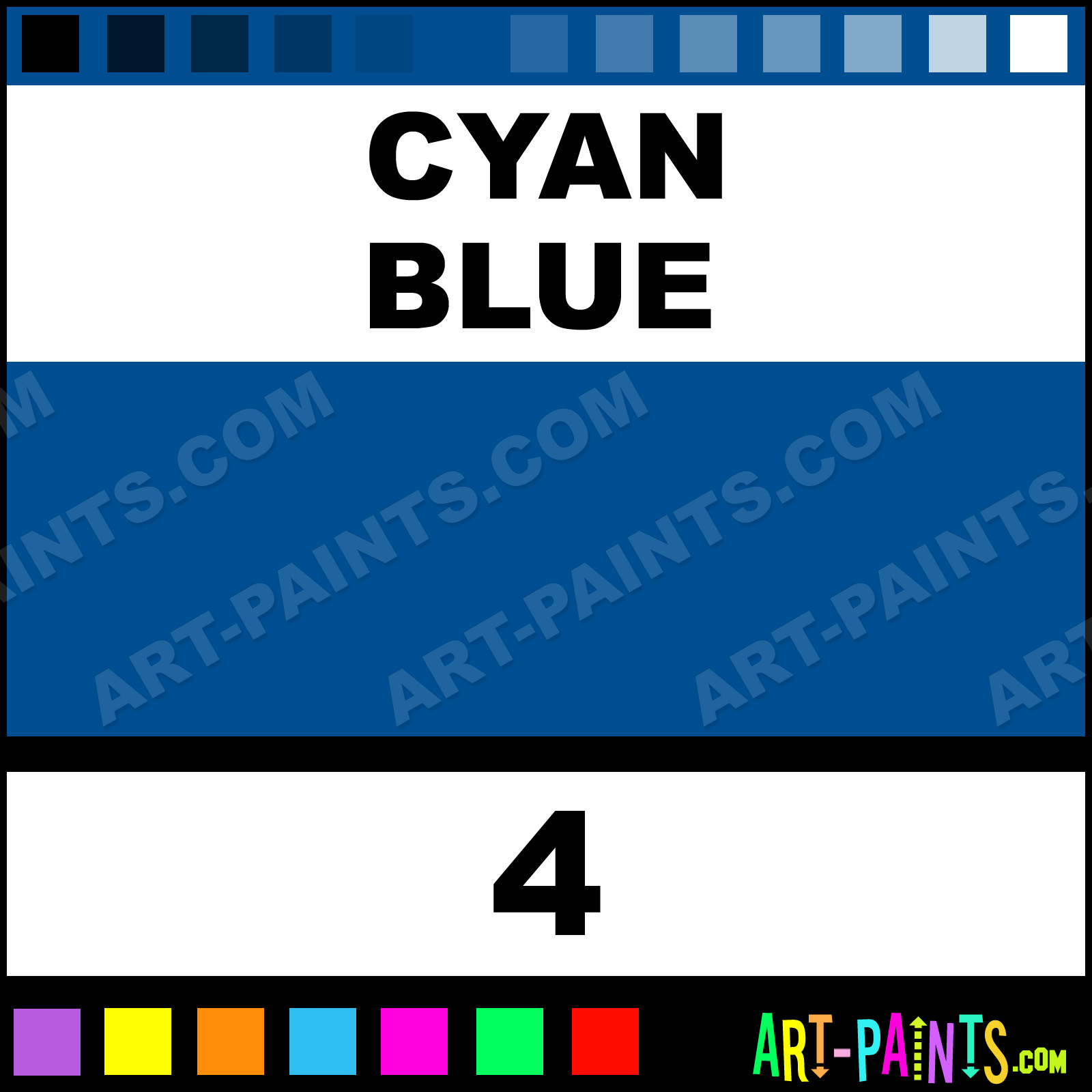 This beautiful Liquid Egg Tempera shade is called Cyan Blue, and comes from a company called Dala. Their product number, along with the HTML color code, RGB, and CMYK codes are listed below. This Beautiful Shade of Cyan Blue and others can be found in the Dala Liquid Art Paint Gallery! Also be sure to browse through the other wonderful Professional Color Galleries to see more of Dala Liquid Egg Tempera Brand Paints and other Paint Manufacturers. And as always, Paint Paint Paint! -Art-Paints.com
