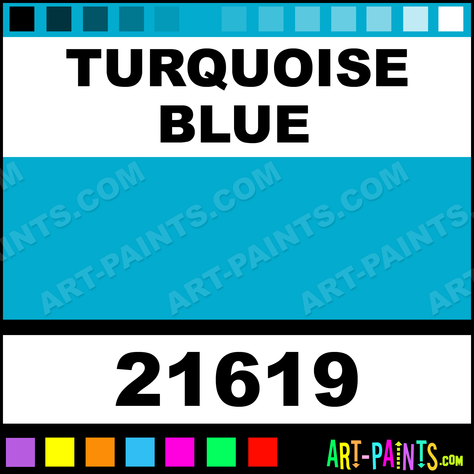 This beautiful Ready To Use Egg Tempera shade is called Turquoise Blue, and comes from a company called Prang. Their product number, along with the HTML color code, RGB, and CMYK codes are listed below. This Beautiful Shade of Turquoise Blue and others can be found in the Prang Ready To Use Art Paint Gallery! Also be sure to browse through the other wonderful Professional Color Galleries to see more of Prang Ready To Use Egg Tempera Brand Paints and other Paint Manufacturers. And as always, Paint Paint Paint! -Art-Paints.com
