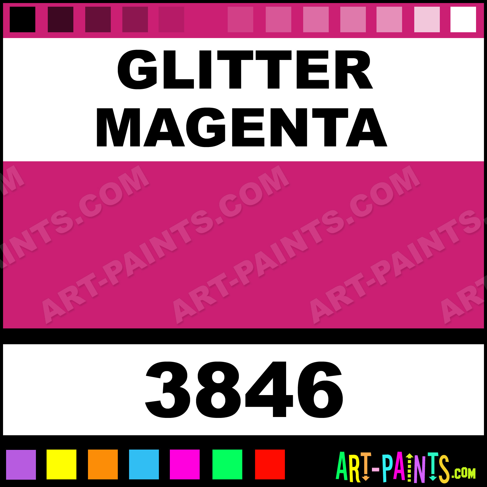 This beautiful Ultra Washable Egg Tempera shade is called Glitter Magenta, and comes from a company called Prang. Their product number, along with the HTML color code, RGB, and CMYK codes are listed below. This Beautiful Shade of Glitter Magenta and others can be found in the Prang Ultra Washable Art Paint Gallery! Also be sure to browse through the other wonderful Professional Color Galleries to see more of Prang Ultra Washable Egg Tempera Brand Paints and other Paint Manufacturers. And as always, Paint Paint Paint! -Art-Paints.com