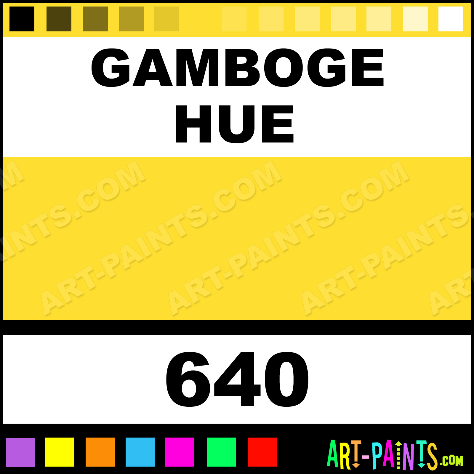 This beautiful Student Watercolor shade is called Gamboge, and comes from a company called Aquafine. Their product number, along with the HTML color code, RGB, and CMYK codes are listed below. This Beautiful Shade of Gamboge and others can be found in the Aquafine Student Art Paint Gallery! Also be sure to browse through the other wonderful Professional Color Galleries to see more of Aquafine Student Watercolor Brand Paints and other Paint Manufacturers. And as always, Paint Paint Paint! -Art-Paints.com