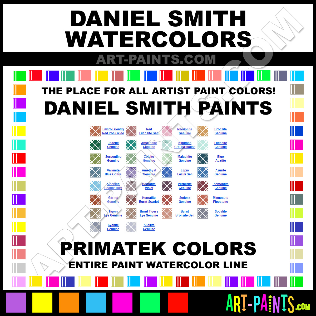 Daniel Smith knows Watercolor paints! They make a wonderful brand of paint called Daniel Smith Primatek Watercolor Colors that suits all types of artists. They strive to perfect the process of color and are one of the most popular Watercolor Paint Brand companies in the world. Enjoy their entire paint brand collection from the list below. Daniel Smith makes wonderful Artists Paints that everyone is sure to enjoy! Choose an Watercolor Paint Color below to view that Hue and all their great related color paints. Paint on!     -Art-Paints.com