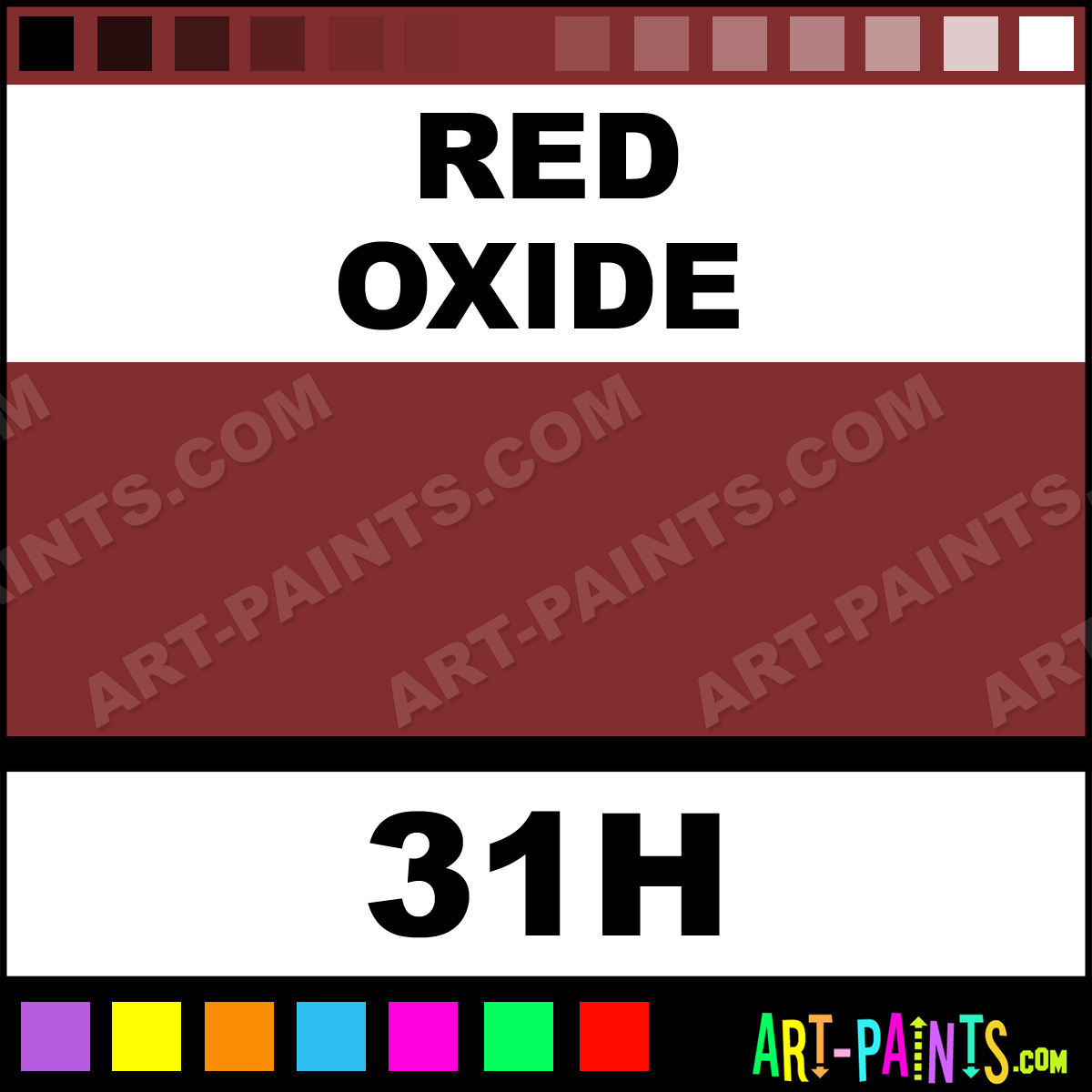 This beautiful Hydrus Watercolor shade is called Red Oxide, and comes from a company called Dr Ph Martins. Their product number, along with the HTML color code, RGB, and CMYK codes are listed below. This Beautiful Shade of Red Oxide and others can be found in the Dr Ph Martins Hydrus Art Paint Gallery! Also be sure to browse through the other wonderful Professional Color Galleries to see more of Dr Ph Martins Hydrus Watercolor Brand Paints and other Paint Manufacturers. And as always, Paint Paint Paint! -Art-Paints.com