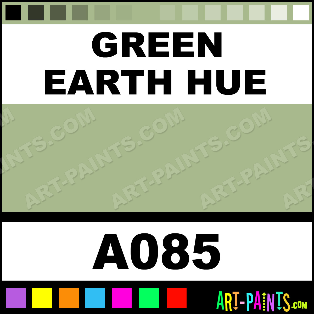 This beautiful Academy Watercolor shade is called Green Earth Hue, and comes from a company called Grumbacher. Their product number, along with the HTML color code, RGB, and CMYK codes are listed below. This Beautiful Shade of Green Earth Hue and others can be found in the Grumbacher Academy Art Paint Gallery! Also be sure to browse through the other wonderful Professional Color Galleries to see more of Grumbacher Academy Watercolor Brand Paints and other Paint Manufacturers. And as always, Paint Paint Paint! -Art-Paints.com