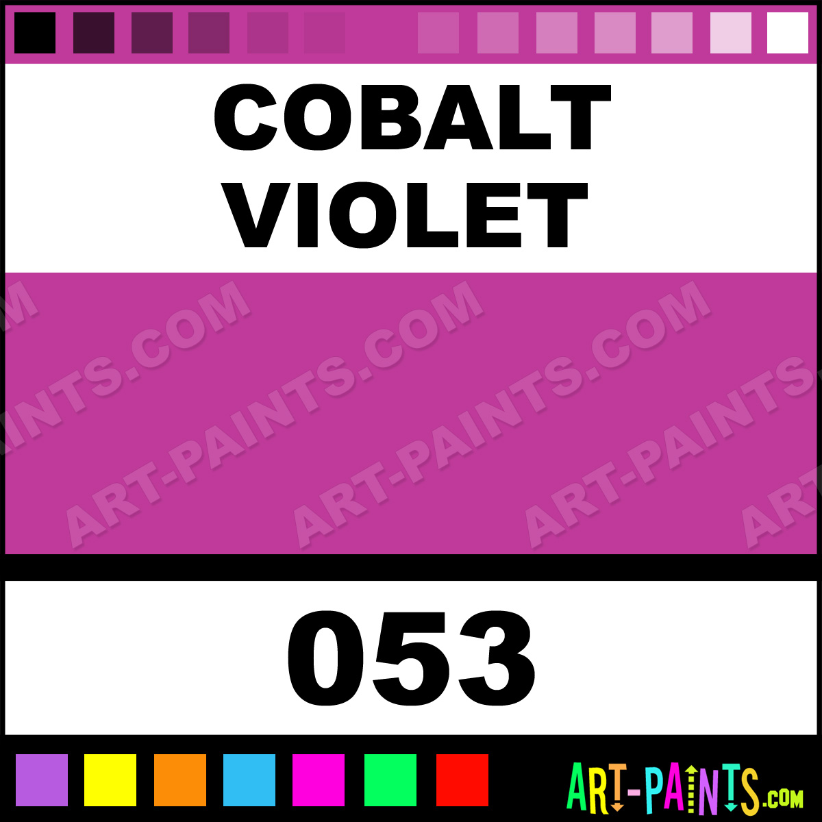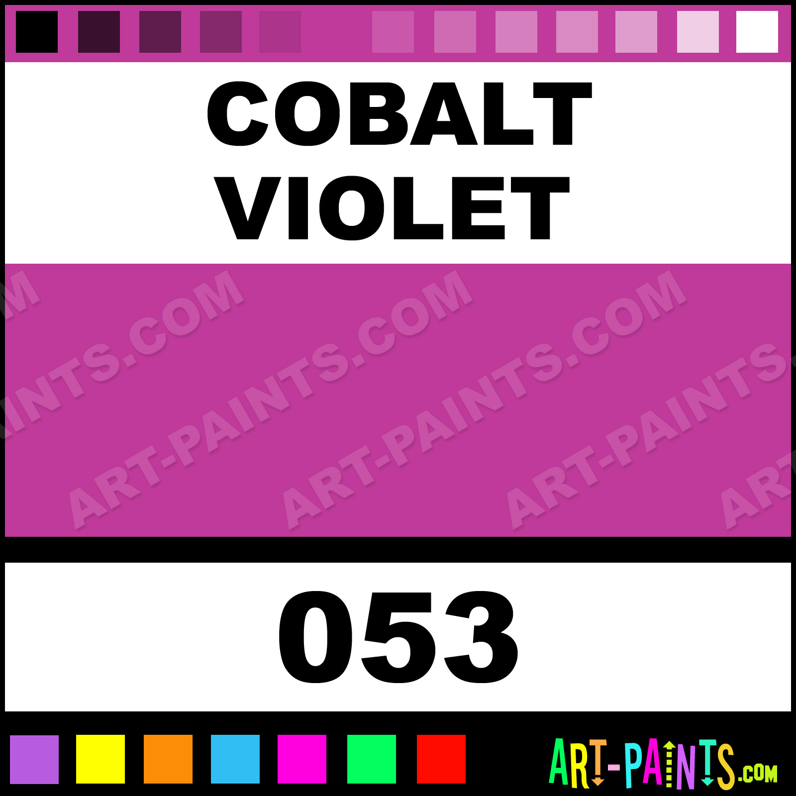 This beautiful Finest Artists Watercolor shade is called Cobalt Violet, and comes from a company called Grumbacher. Their product number, along with the HTML color code, RGB, and CMYK codes are listed below. This Beautiful Shade of Cobalt Violet and others can be found in the Grumbacher Finest Artists Art Paint Gallery! Also be sure to browse through the other wonderful Professional Color Galleries to see more of Grumbacher Finest Artists Watercolor Brand Paints and other Paint Manufacturers. And as always, Paint Paint Paint! -Art-Paints.com