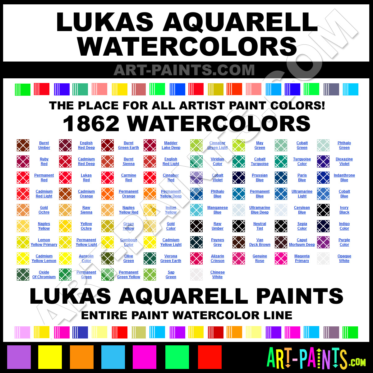 Lukas knows Watercolor Paints! They make wonderful brands of paint for all types of artists. They strive to perfect the process of color and are one of the most popular Watercolor Paint Brand companies in the world. Enjoy their entire brand collection from the list below. Lukas makes a couple different types of Watercolor Paint Brands including its Aquarell 1862 Paints and its Aquarell Studio Paints! Choose an Watercolor Paint type below to view that brand and all the related Color Paints and Hues in it. Paint on!     -Art-Paints.com