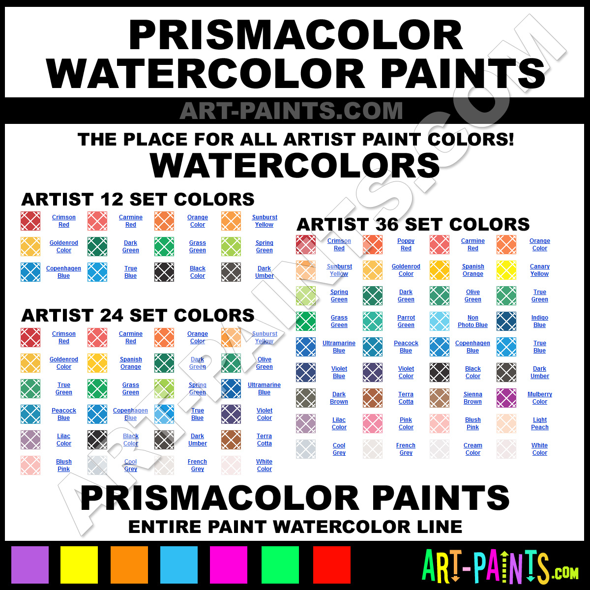 Prismacolor knows Watercolor Paints! They make wonderful brands of paint for all types of artists. They strive to perfect the process of color and are one of the most popular Watercolor Paint Brand companies in the world. Enjoy their entire brand collection from the list below. Prismacolor makes a couple different types of Watercolor Paint Brands including its Artist 12 Set Paints, 24 Set and its Artist 36 Set Paints! Choose an Watercolor Paint type below to view that brand and all the related Color Paints and Hues in it. Paint on!     -Art-Paints.com