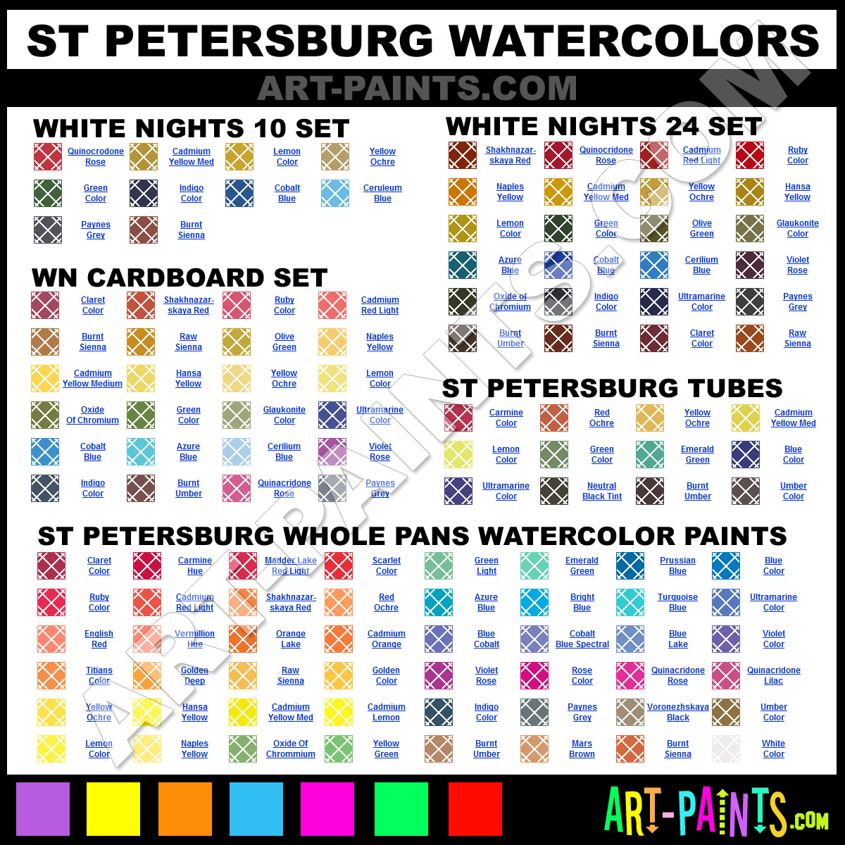 St Petersburg knows Watercolor Paints! They make wonderful brands of paint for all types of artists. They strive to perfect the process of color and are one of the most popular Watercolor Paint Brand companies in the world. Enjoy their entire brand collection from the list below. St Petersburg makes a couple different types of Watercolor Paint Brands including its White Nights Set, 10 and 24 Paint Colors, White Nights Cardboard Set, Tube Set Paints and Whole Pan Watercolor Line Paints! Choose an Watercolor Paint type below to view that brand and all the related Color Paints and Hues in it. Paint on!     -Art-Paints.com